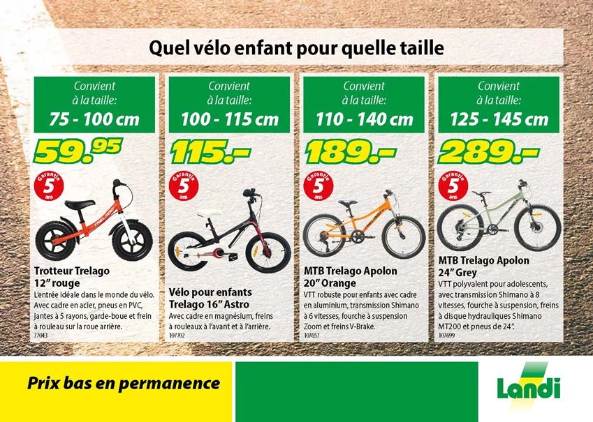 L’enfant doit vérifier que la selle et le guidon sont correctement réglés et qu’il se sent en sécurité et à l’aise. Il doit pouvoir poser les deux pieds au sol sans difficulté. En roulant, il se rend compte s’il parvient à bien diriger et contrôler le vélo. C’est surtout dans les virages, à l’arrêt et lors des accélérations qu’il verra si le vélo lui convient. Un essai dans votre magasin LANDI lui permettra de prendre confiance en lui. Il peut tester les freins, les pédales et les vitesses et se familiariser avec son nouveau vélo.
