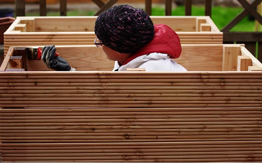 Stabilité : pour les plates-bandes surélevées longues, fixez des traverses supplémentaires (en lattes de bois) au milieu de chaque côté long afin de résister à la pression ultérieure du matériau de remplissage. [Image à titre d'illustration]