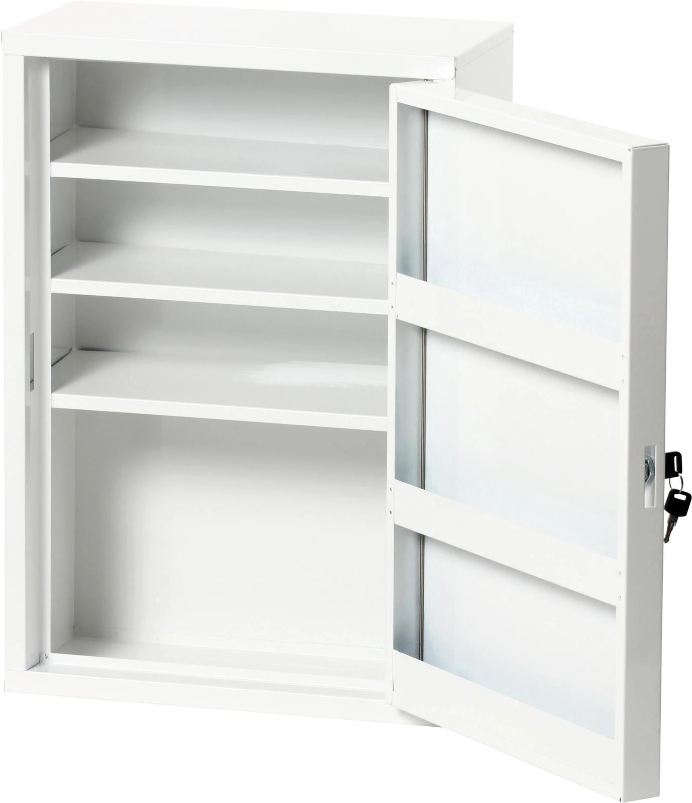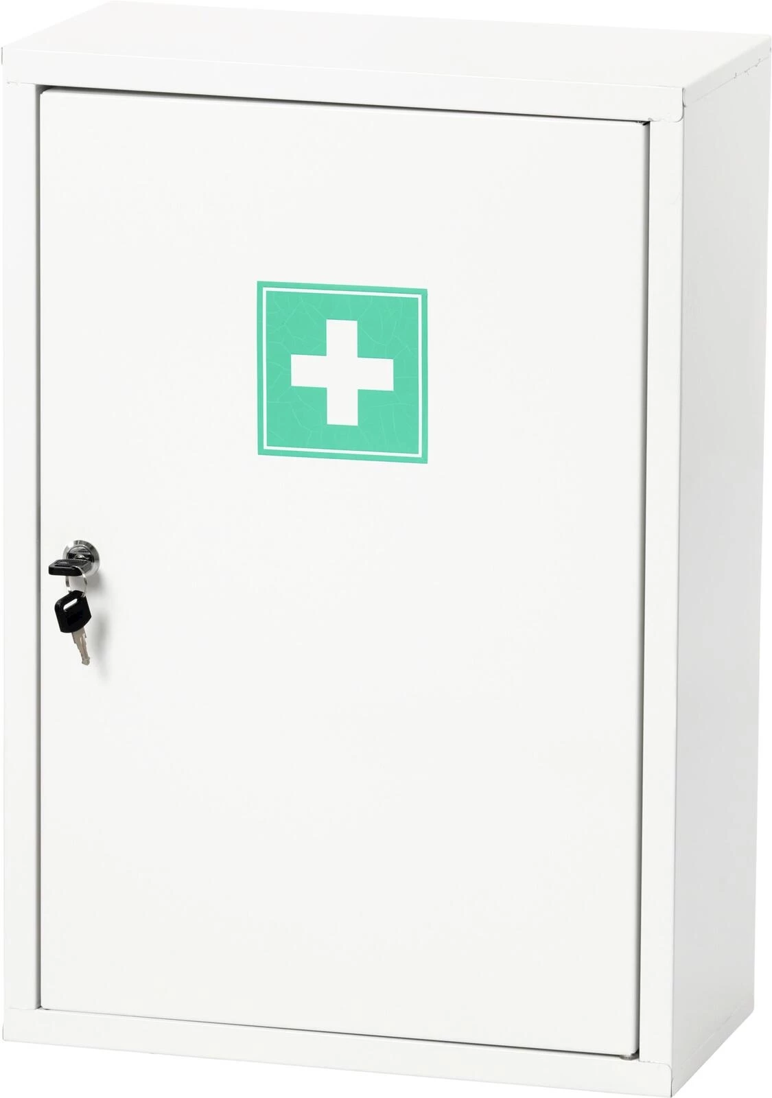 L'armoire métallique laquée est équipée de deux clés et elle peut être fixée en toute sécurité au mur grâce à quatre vis. À l'intérieur, des étagères fixes et des compartiments de rangement à l'intérieur de la porte offrent une meilleure visibilité. L'armoire est idéale pour ranger le matériel de premiers secours à portée de main et bien protégé, mais elle peut également être utilisée pour d'autres types de matériel. Un autocollant avec une croix verte, symbole des premiers secours, est fourni et il peut être apposé si nécessaire. Charnière à droite.