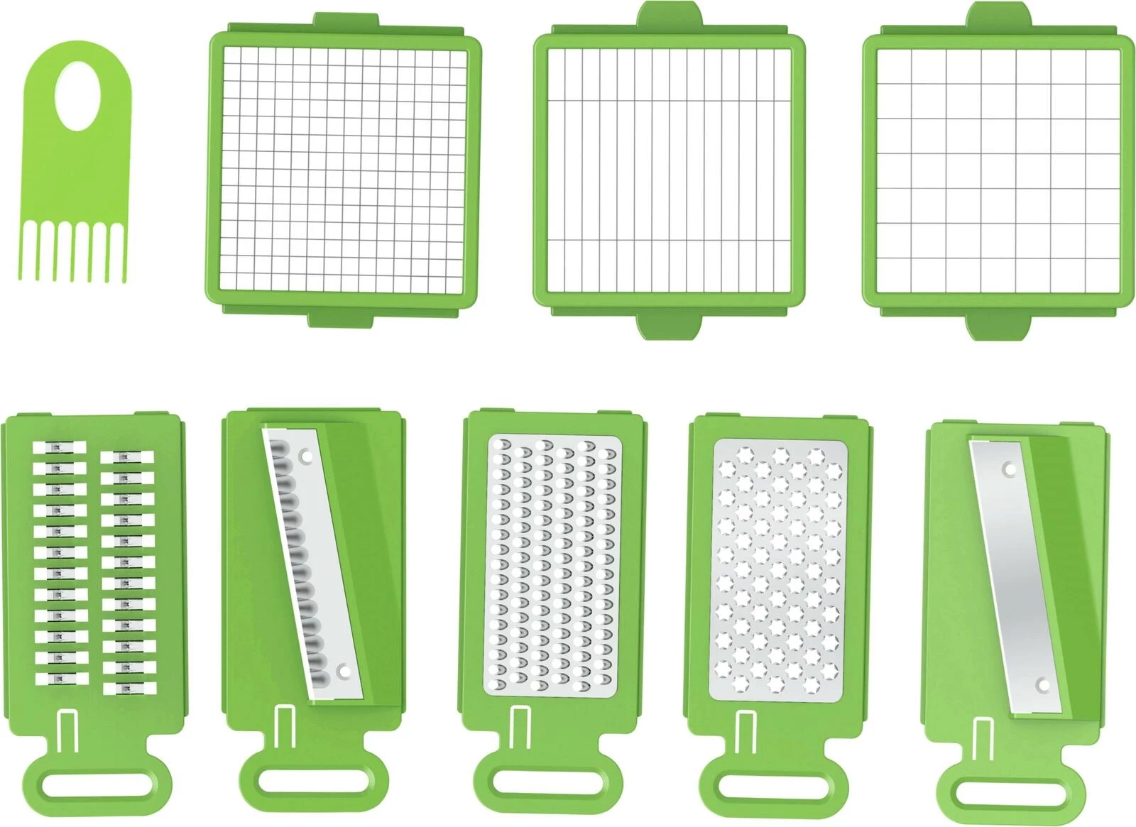 Avec ses 8 accessoires de coupe différents, le coupe-légumes Prima Vista transforme facilement les légumes frais en fines tranches, juliennes, cubes ou râpés. Grâce à la combinaison astucieuse du récipient, de la plaque d'insertion des lames, du récipient à accessoire et du couvercle de conservation, vous pouvez également utiliser le coupe-légumes comme boîte de conservation pratique. Les cinq lames de coupe et de râpage, les trois lames à cubes (14 × 14 cm, 7 × 7 cm, 3 × 14 cm) et la trancheuse à fonction ondulée permettent une coupe rapide et régulière. La poignée de sécurité intégrée garantit une utilisation en toute sécurité, même lorsque les légumes deviennent plus petits, alors que la fourchette et la brosse de nettoyage facilitent le retrait. Toutes les pièces passent au lave-vaisselle.