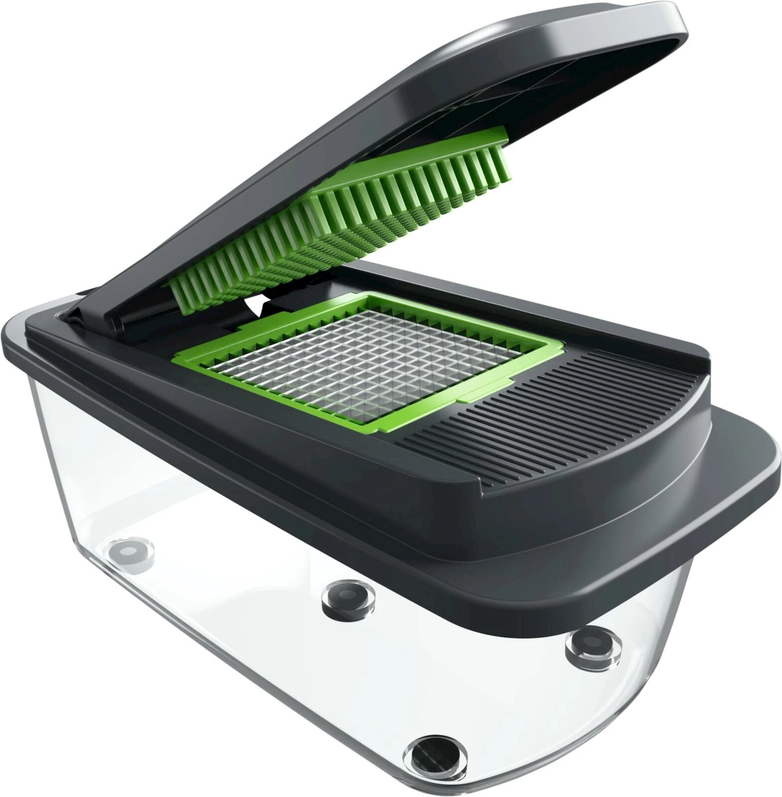 Prima Vista. Transforme les légumes en cubes, tranches ou lamelles. Avec 5 râpes, 3 lames à cubes, une trancheuse et bien plus encore. Matériau : plastique, acier inoxydable. Dimensions : 25 × 13,5 × 13,2 cm.