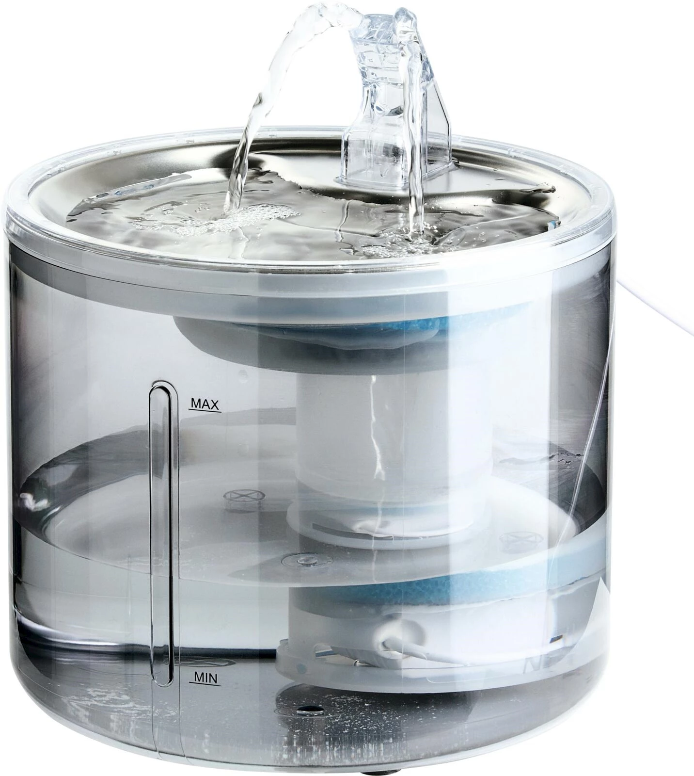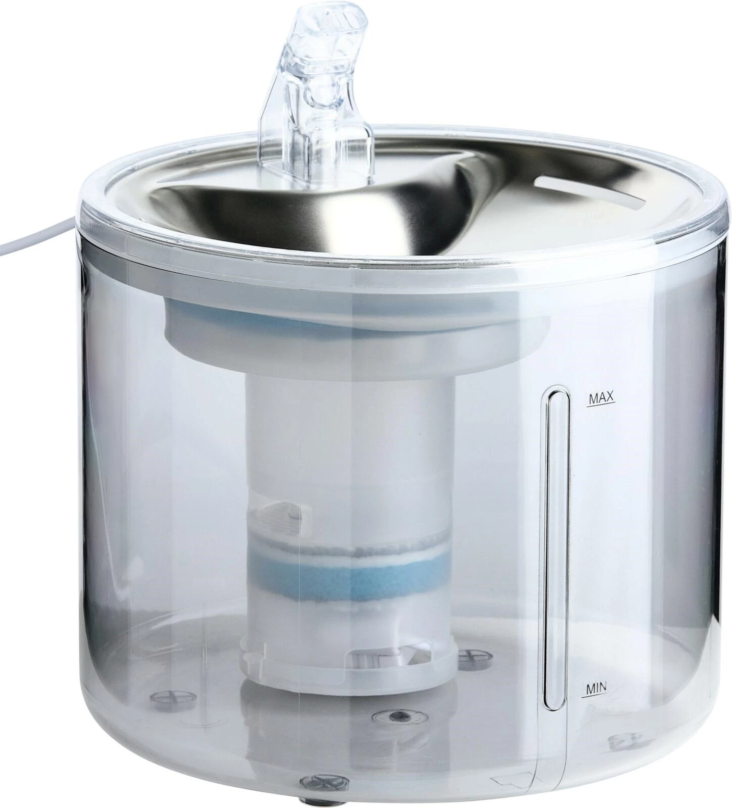 La fontaine à eau pratique, avec ses dimensions compactes de 19 × 19 × 17 cm, convient parfaitement aux chats et aux petits chiens. Le réservoir de 2,6 litres fournit à votre animal de compagnie de l'eau filtrée pendant plusieurs jours. Grâce au filtre, les poils et les particules de saleté sont capturés, de sorte que votre compagnon à quatre pattes dispose toujours d'une eau propre. Le réservoir est en polycarbonate et sa transparence vous permet de contrôler facilement le niveau d'eau.