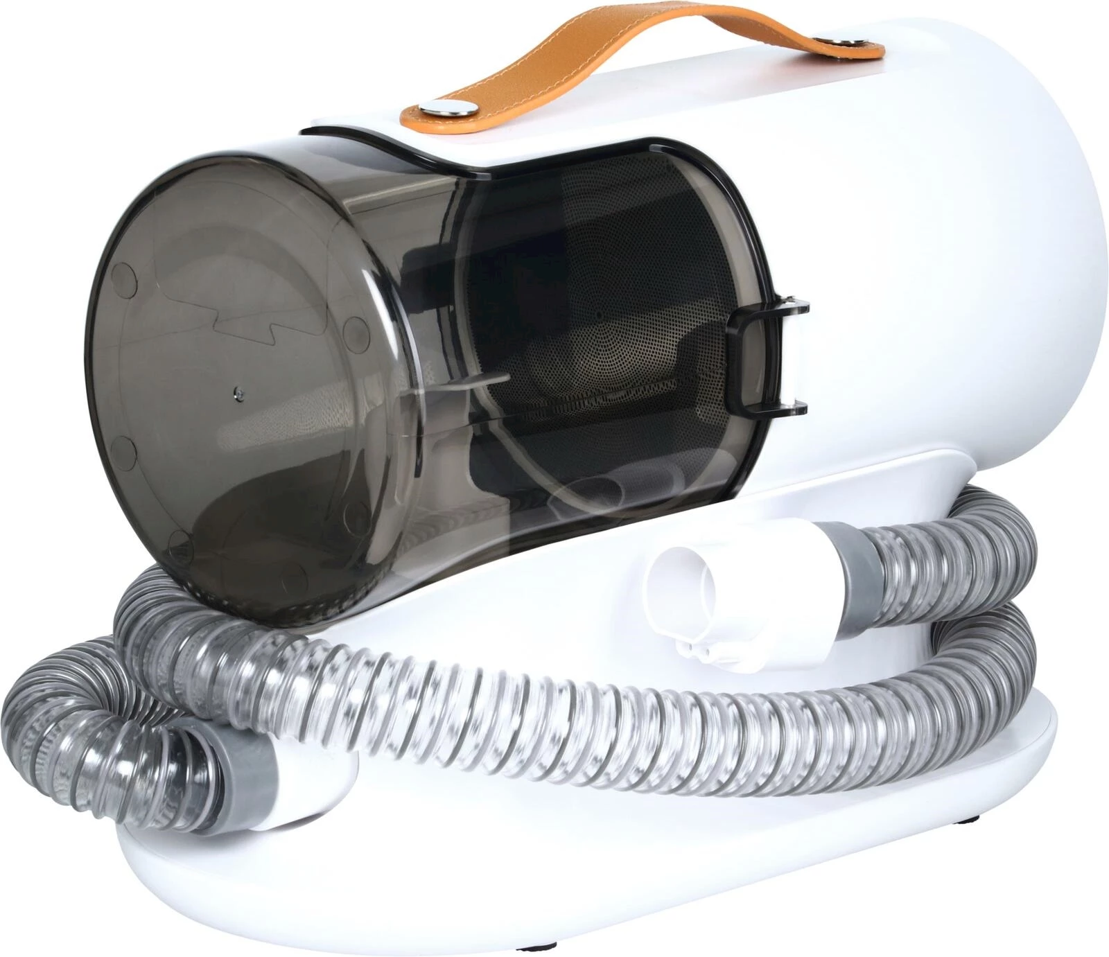 Kit de toilettage silencieux pour chiens avec 5 embouts magnétiques, tuyau de 1,6 m et bac à poussière de 2 l. Idéal pour brosser, tondre et nettoyer le pelage. Dimensions : 32 × 16 × 22,5 cm.