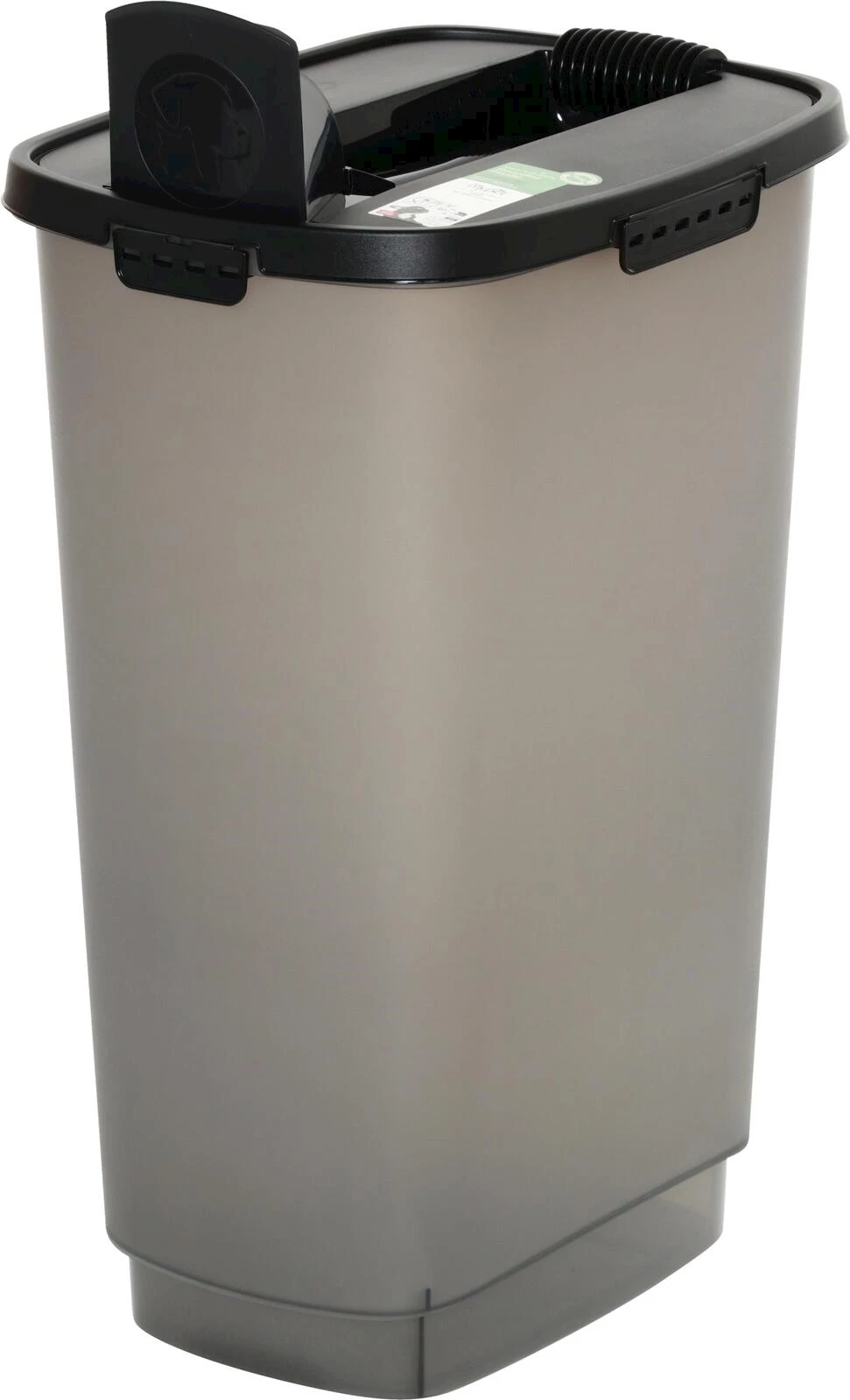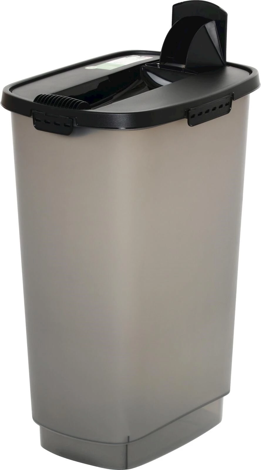 Le récipient est en plastique robuste. Il est facile à nettoyer et il dispose d'un couvercle pratique avec ouverture de remplissage intégrée. Cela permet de doser facilement la nourriture sans avoir à retirer complètement le couvercle. La conception hermétique protège efficacement la nourriture de l'humidité, des odeurs et des nuisibles. Une spatule à nourriture assortie est également incluse.