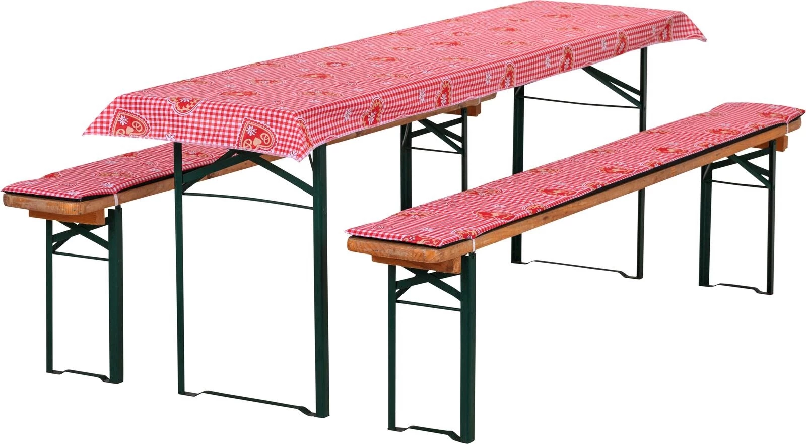 Pour les garnitures de fête. En polycoton - tissu mélangé. Rempli d'ouate non tissée. Dimensions des coussins de banc : 220 × 25 cm. Dimensions nappe : 240 × 100 cm.