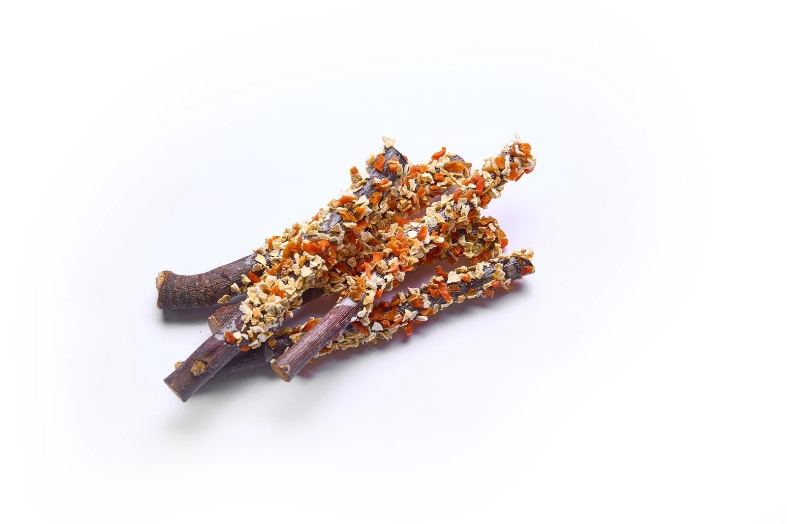 Bâtonnets à ronger en bois d’arbres fruitiers avec carotte et céleri. 100 % naturels, favorisent la santé dentaire et veillent à une occupation adaptée.