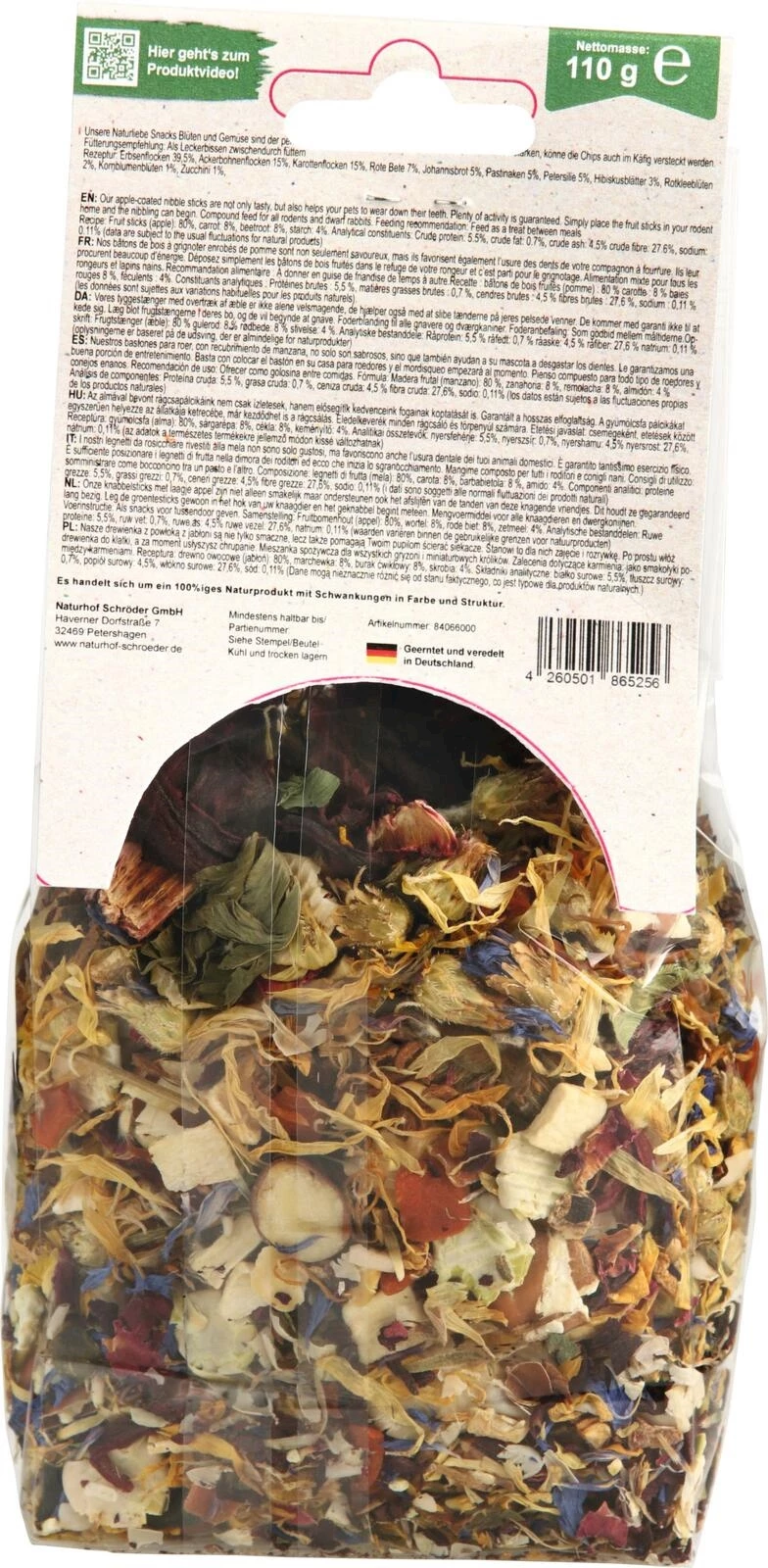 Ce mélange varié offre une combinaison colorée et équilibrée de légumes précieux, d'herbes saines et de fleurs aromatiques, idéale pour les lapins, les cochons d'Inde, les hamsters et autres rongeurs. Avec une teneur élevée de 39,7 % de flocons de pois, 15,1 % de flocons de fèves et 15,1 % de carottes coupées en dés, il fournit des nutriments et des fibres alimentaires importants pour une alimentation adaptée à l'espèce. Le mélange est complété par de la betterave rouge, de la caroube, des dés de panais et du persil, qui apportent de la variété et un plaisir supplémentaire à grignoter. Le mélange est complété par une variété colorée de pétales d'hibiscus, de trèfle rouge, de bleuet, de tournesol et de rose, qui sont non seulement délicieux, mais aussi très esthétiques dans la gamelle. Bien sûr, sans additifs artificiels, pour une alimentation saine et variée, 100 % naturelle.