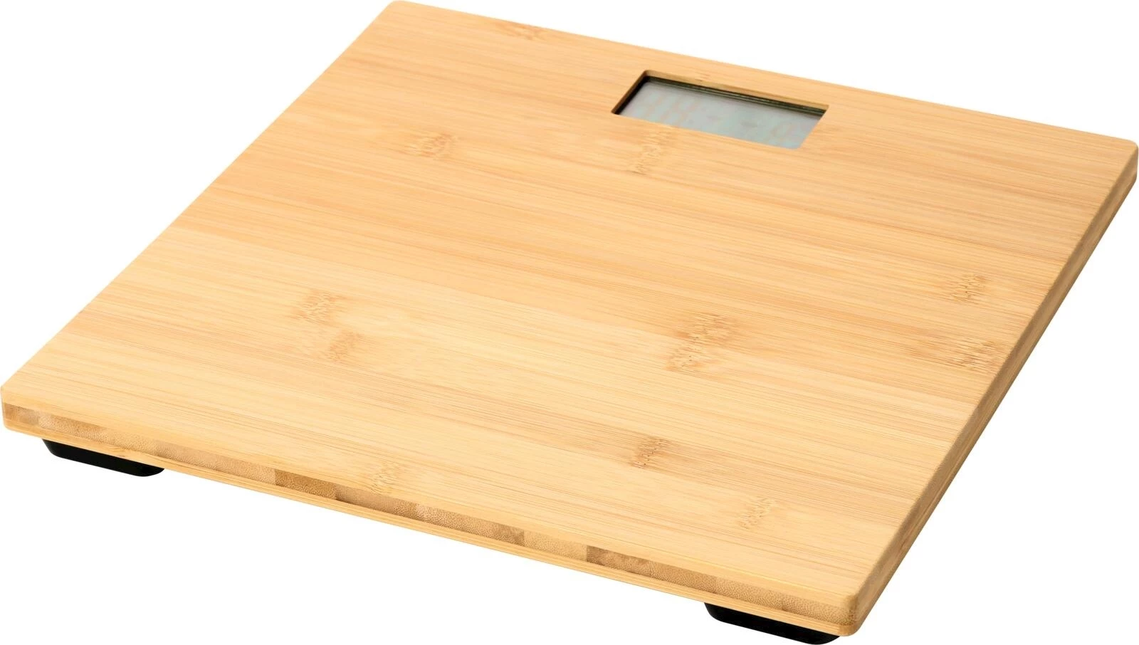 Avec écran LCD numérique. Matériau : bois de bambou. Capacité maximale : 180 kg. Dimensions : 30 × 30 × 3,2 cm. Piles non incluses (2 piles AAA).