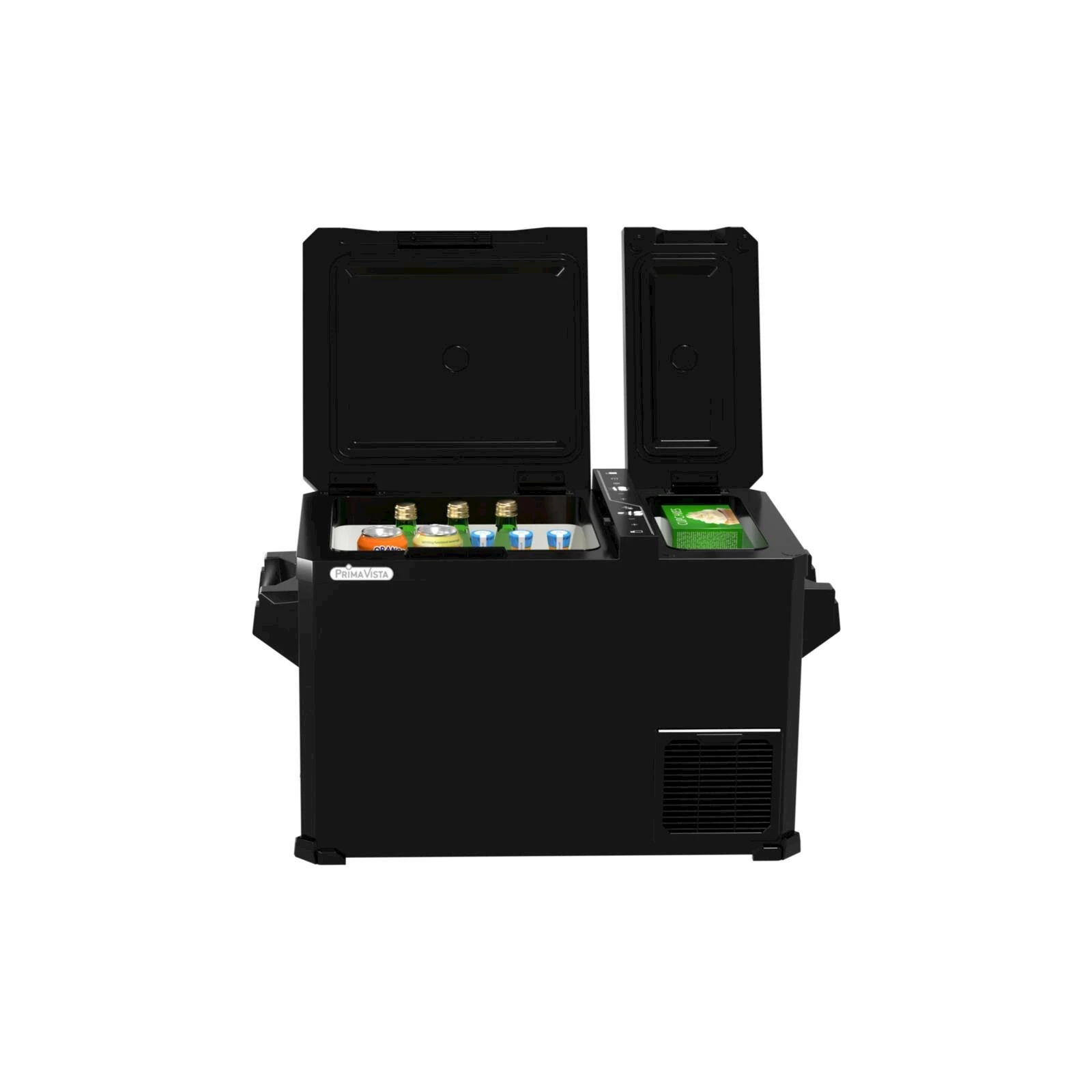 Réglable de -18 à +20 °C. Avec deux compartiments réglables indépendamment, fonctionnement 12/24 V ou 230 V et protection de la batterie de voiture. Dimensions : 78 × 40 × 46,5 cm..