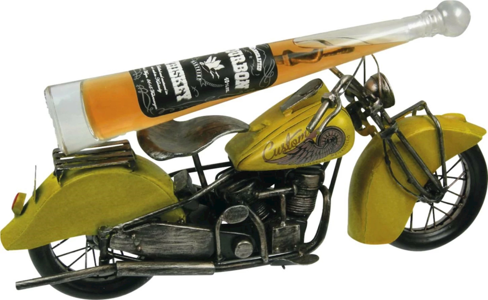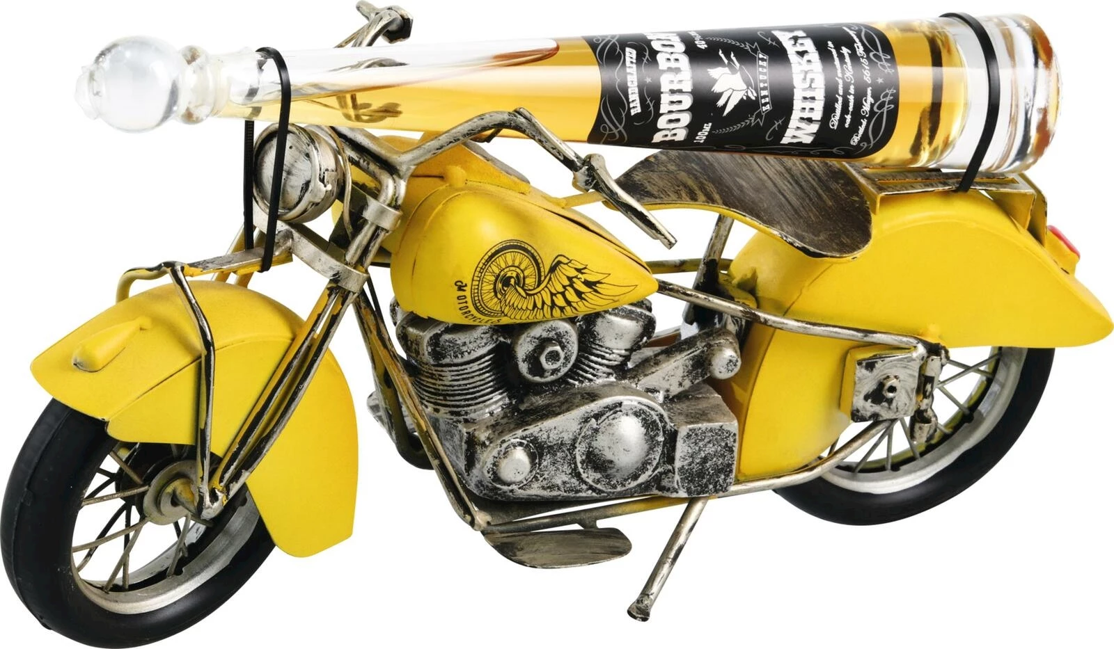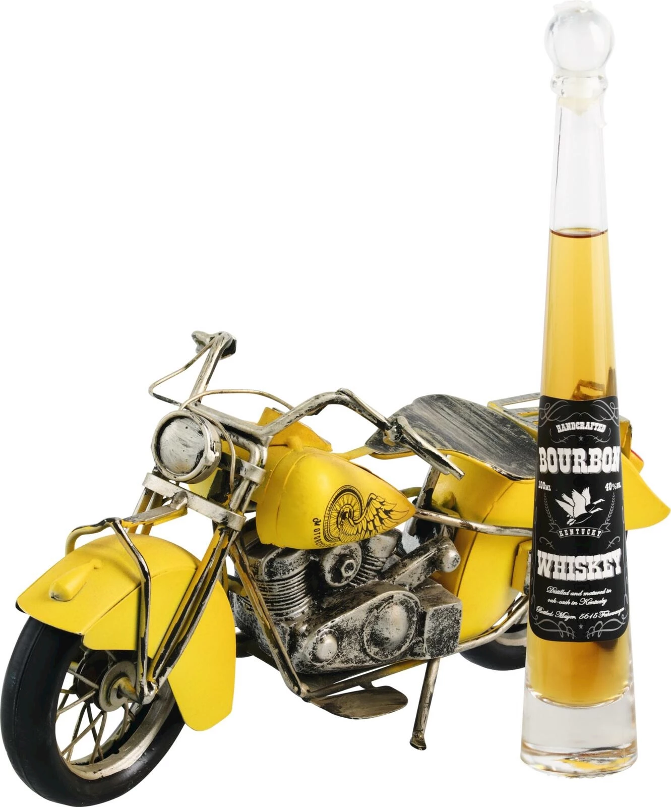 Ce whiskey « bourbon » est fabriqué à partir du moût de maïs (sans ajout de céréales) et cuit ensuite. Entreposé dans des fûts de chêne blanc neufs calcinés à l’intérieur, il obtient son goût fumé typique. Il séduit par sa couleur brun doré, ses arômes complexes de fruits, de chocolat, de chêne et de tabac et des notes fumées. La bouteille est emballée sur un Custom Bike jaune original : le cadeau parfait pour les amateurs de la moto.