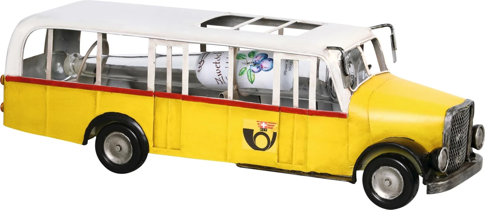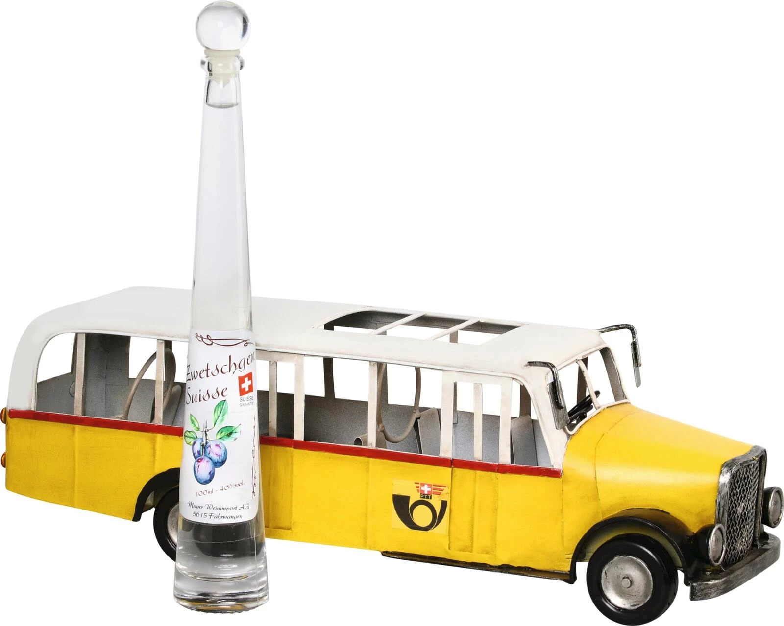 CarPostal fait partie de l’histoire de Suisse au même titre que Guillaume Tell. Le modèle réduit nostalgique attire tous les regards et réchauffe le cœur de tous les collectionneurs. Avec la bouteille de délicieuse eau-de-vie de prune, il est le cadeau idéal pour tous les fans nostalgiques.