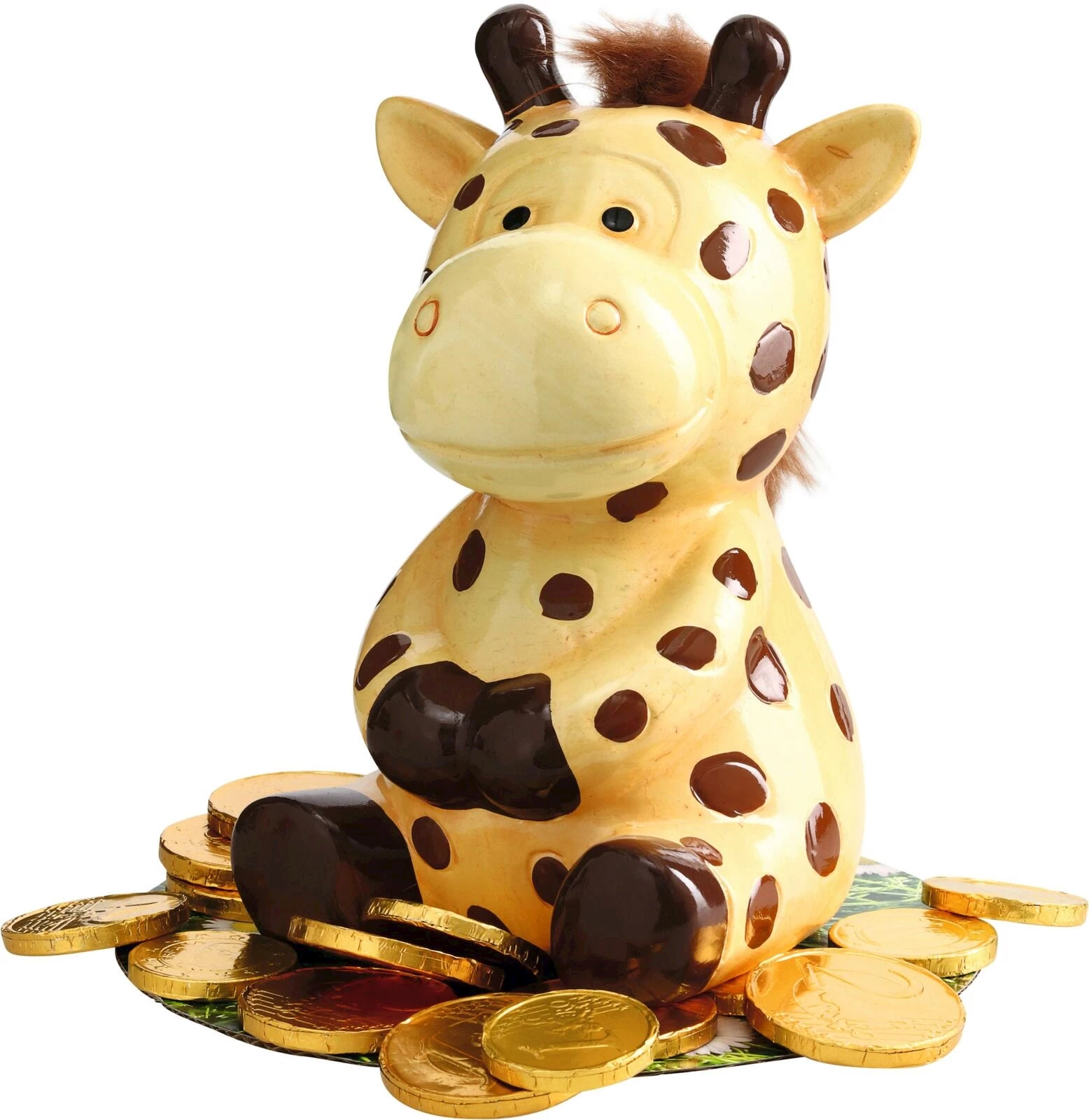 Ce qu’il faut pour les petits et grands fans d’animaux. La girafe est pour les câlins. Elle est joliment emballée avec des écus en chocolat fin et un cadeau original pour une personne aimée.