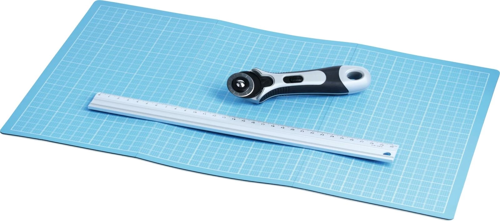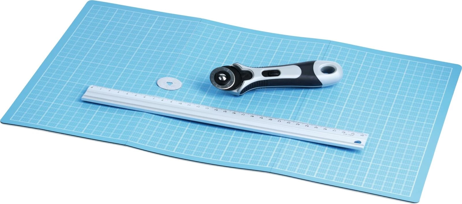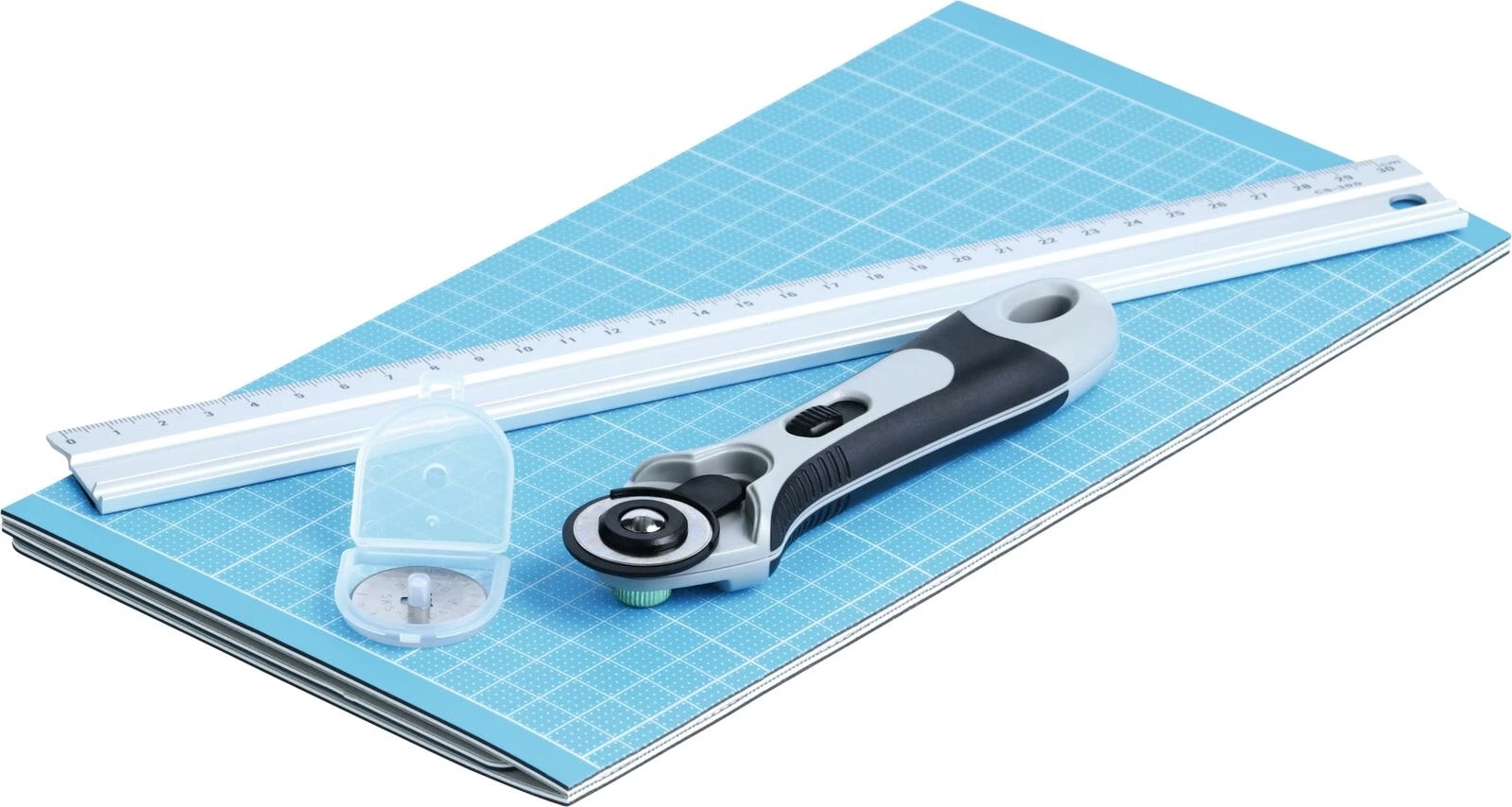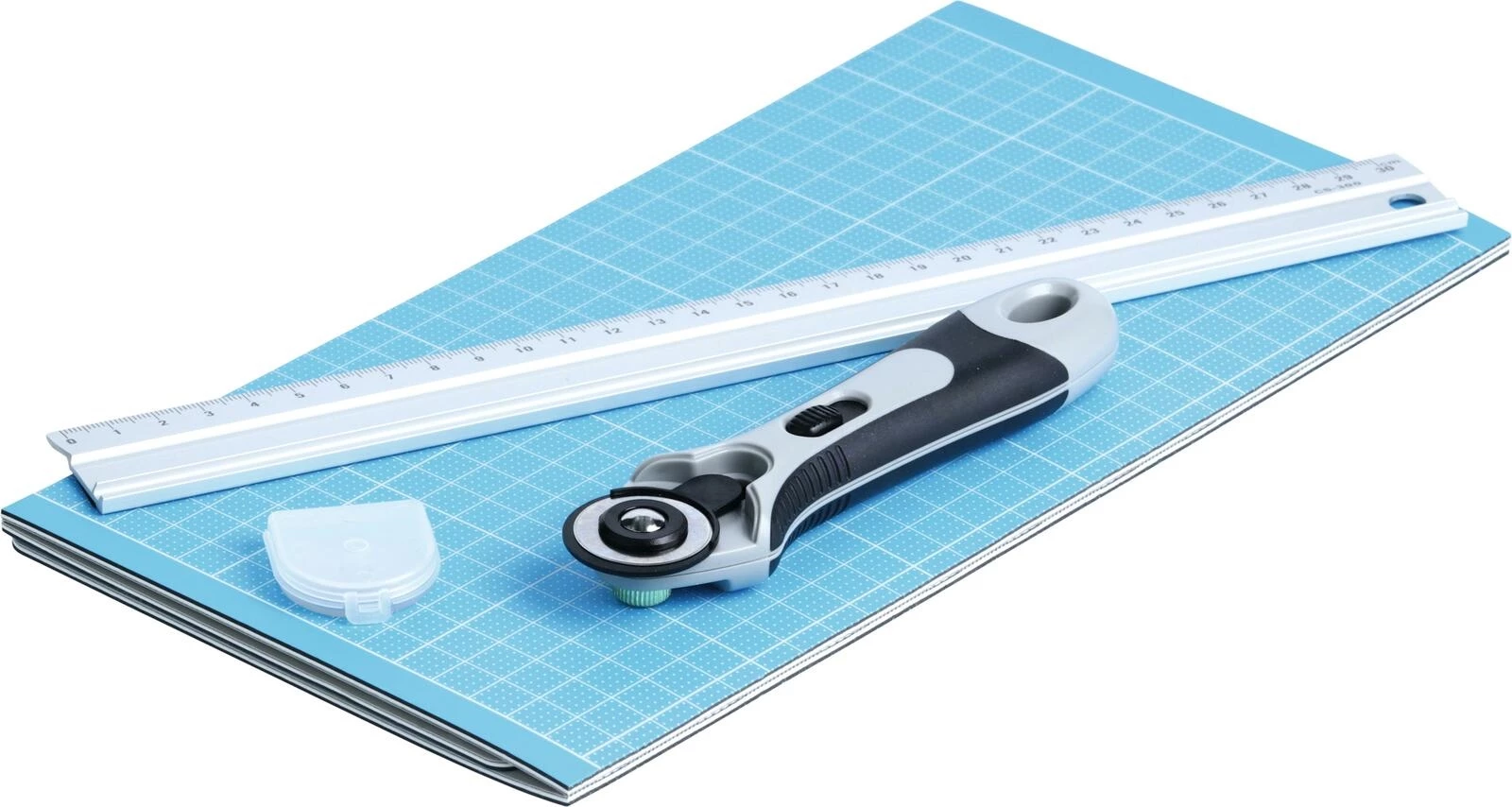 Le kit de découpe avec couteau à molette est la solution idéale pour des travaux de découpe précis et propres pour les projets de bricolage, de couture ou de papier. Il se compose d'un couteau à molette ergonomique qui permet des coupes précises, d'une règle en aluminium de 30 cm avec une face inférieure antidérapante pour un guidage rectiligne et d'un support résistant et anti-coupure qui protège efficacement votre surface de travail. Pour une longue durée d'utilisation, une lame de rechange est également incluse dans le kit.