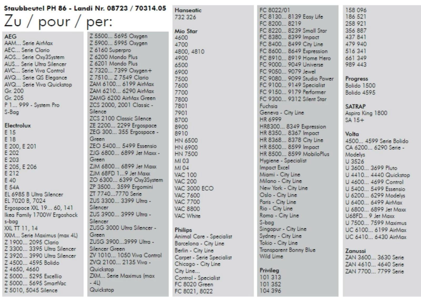 Sac à poussière PH 86 adapté à différents aspirateurs AEG, Electrolux, Miostar et Philips. Revêtu de non-tissé. Fermable grâce à un curseur en carton. Contenu de la livraison : 5 pièces.