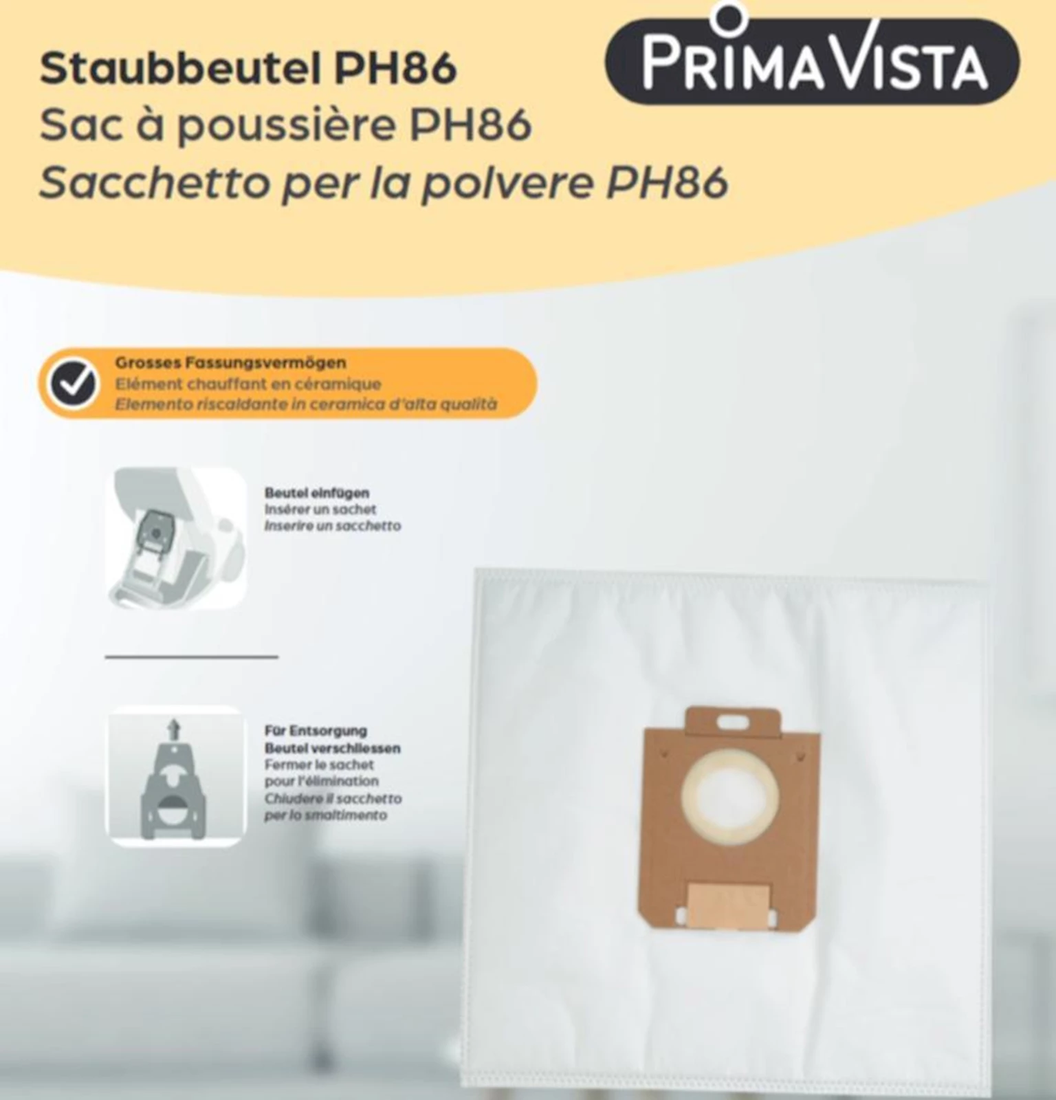 Les sacs à poussière PH 86 conviennent à divers aspirateurs AEG, Electrolux, Miostar et Philips. Grâce au non-tissé à l'intérieur du sac, même les plus petites particules de poussière sont retenues. L'ouverture du carton en haut du sac à poussière est dotée d'un curseur pratique pour une fermeture hygiénique.