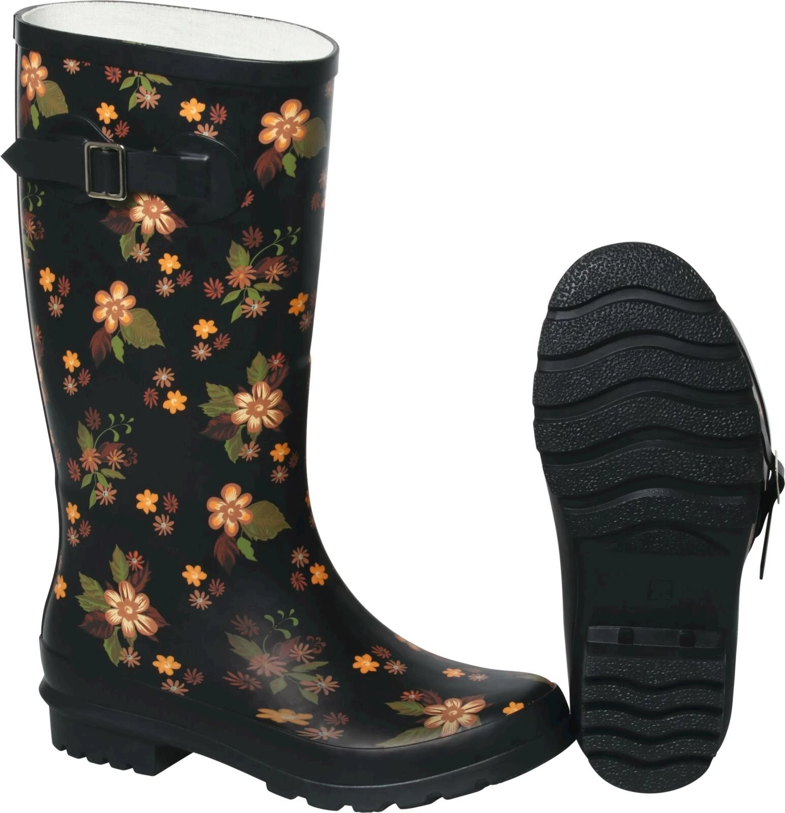 Atrium. Matériau : 100 % caoutchouc. Bottes élégantes ornées d'un motif floral détaillé. Idéales pour les jours de pluie. Couleur : noir/orange. Pointures : 36 - 41.