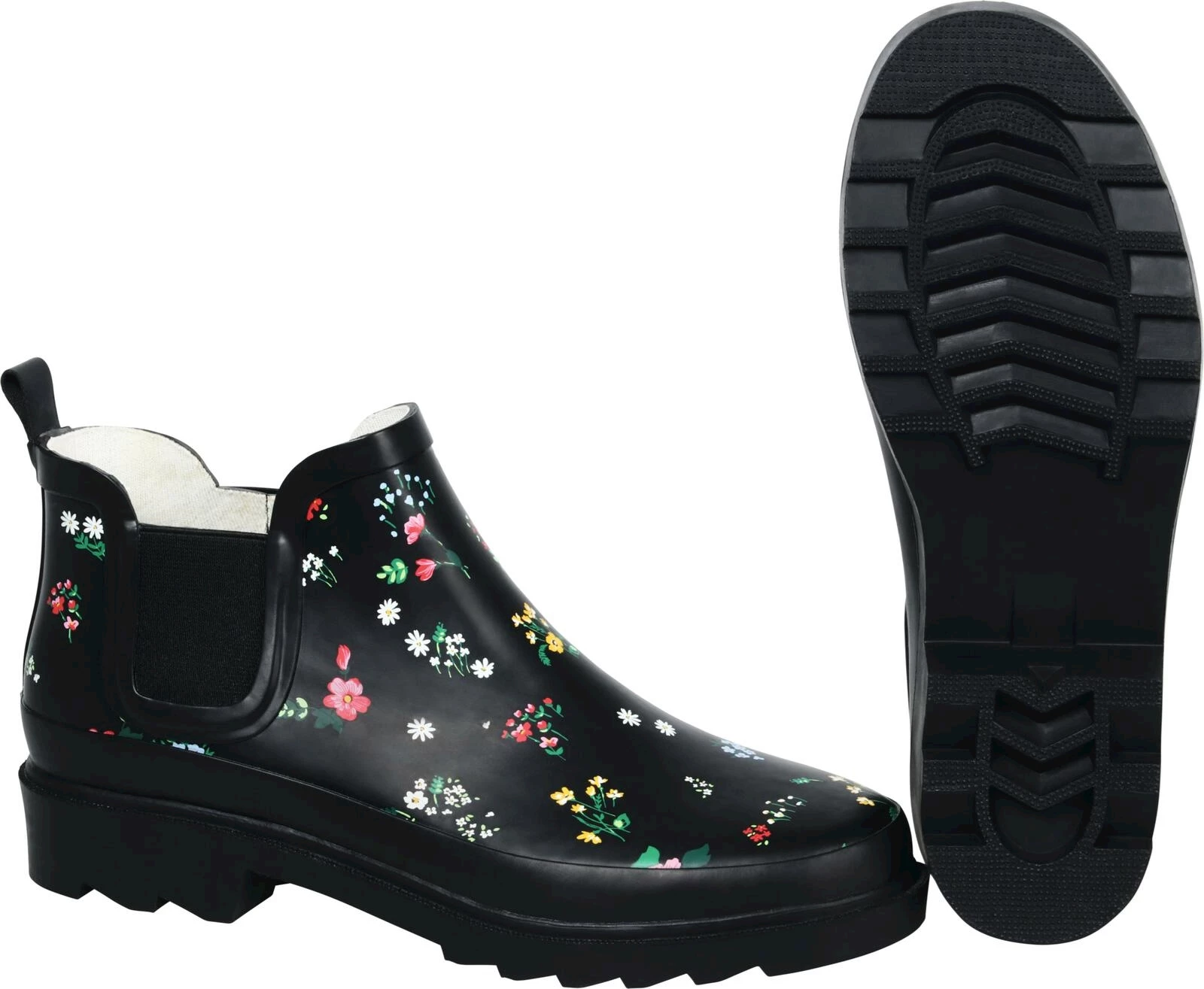 Atrium. Matière : 100 % caoutchouc. Bottines élégantes à imprimé floral, parfaites pour le printemps. Couleur : noir. Pointures : 37 - 41.