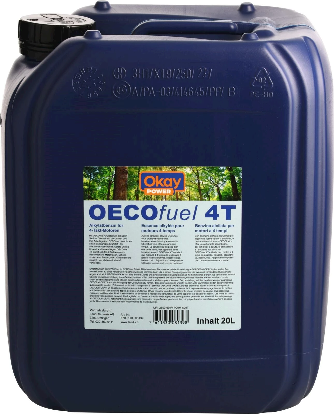 Avec l'essence alkylée OECOfuel Okay Power, vous protégez votre santé, l'environnement et vos outils de travail. C'est un carburant unique - pour tous ceux qui se soucient de leur santé, de leurs outils et de l'environnement. Ce carburant est peu polluant et plus propre que l'essence traditionnelle. Il sent moins fort et est moins nocif pour l'environnement. En outre, il est moins sensible à la corrosion et aux obstructions, ce qui prolonge la durée de vie de vos outils de travail. Cette essence convient aux moteurs à 4 temps des tondeuses à gazon, des motoculteurs, des chasse-neige, des bateaux, etc. Il est possible d'y ajouter de l'huile.