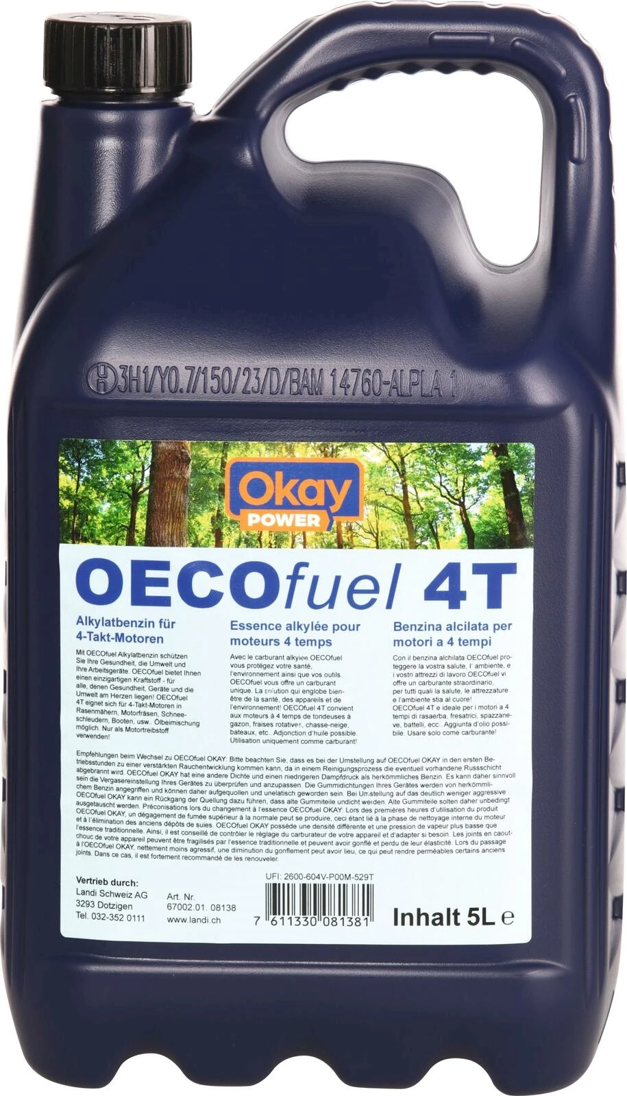 Avec l'essence alkylée OECOfuel Okay Power, vous protégez votre santé, l'environnement et vos outils de travail. C'est un carburant unique - pour tous ceux qui se soucient de leur santé, de leurs outils et de l'environnement. Ce carburant est peu polluant et plus propre que l'essence traditionnelle. Il sent moins fort et est moins nocif pour l'environnement. En outre, il est moins sensible à la corrosion et aux obstructions, ce qui prolonge la durée de vie de vos outils de travail. Cette essence convient aux moteurs à 4 temps des tondeuses à gazon, des motoculteurs, des chasse-neige, des bateaux, etc. Il est possible d'y ajouter de l'huile.