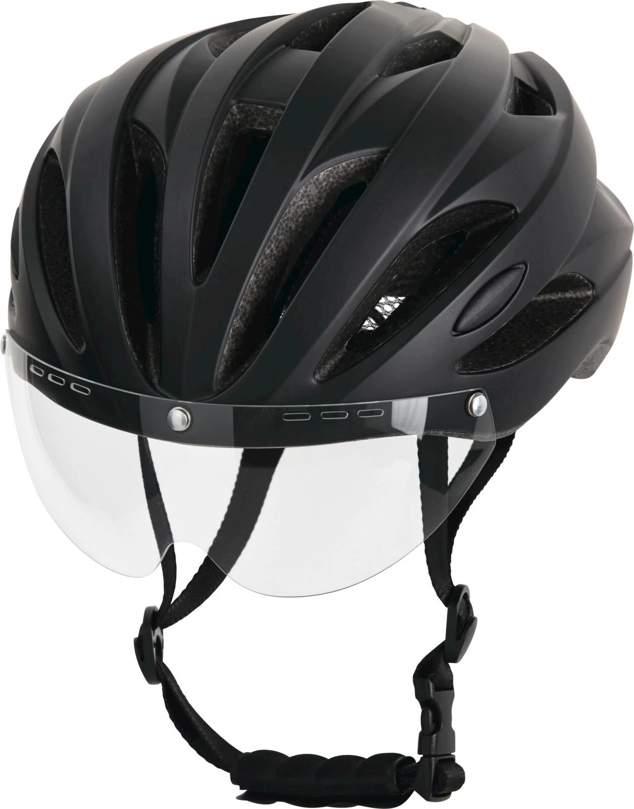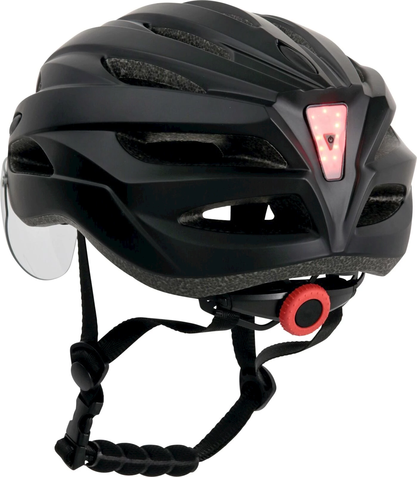 Ce casque de vélo est équipé d'une visière normale et d'une visière solaire. En outre, le casque de sécurité a plusieurs fentes d'aération avec moustiquaires intégrées. Le casque de vélo est contrôlé selon la norme DIN EN 1078 CE. Un feu arrière est intégré à l’arrière du casque pour garantir plus de sécurité. Le casque est disponible en deux tailles. Le casque peut être adapté au tour de tête grâce au réglage à l’arrière. La taille M correspond au tour de tête de 58 – 61 cm. Nous recommandons d’essayer le casque avant de l’acheter. Le casque doit être placé horizontalement sur la tête et la taille doit être réglée de manière à empêcher au casque de vélo de trop bouger. Le casque doit bien tenir sur la tête même sans la mentonnière. Serrer la mentonnière jusqu’à ne pouvoir insérer que deux doigts entre le menton et la mentonnière. Couleur : noire.
