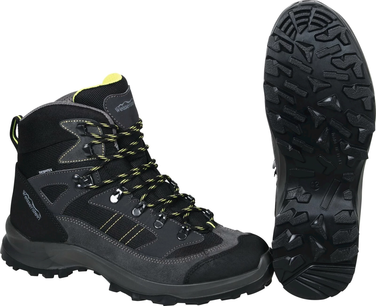 Weissenstein. En cuir velours. Bonne protection contre l'humidité grâce à la membrane Respitex. Avec semelle de trekking résistante à l'usure. L'embout protège les orteils. Pointures : 40 - 47. Couleur : noir.