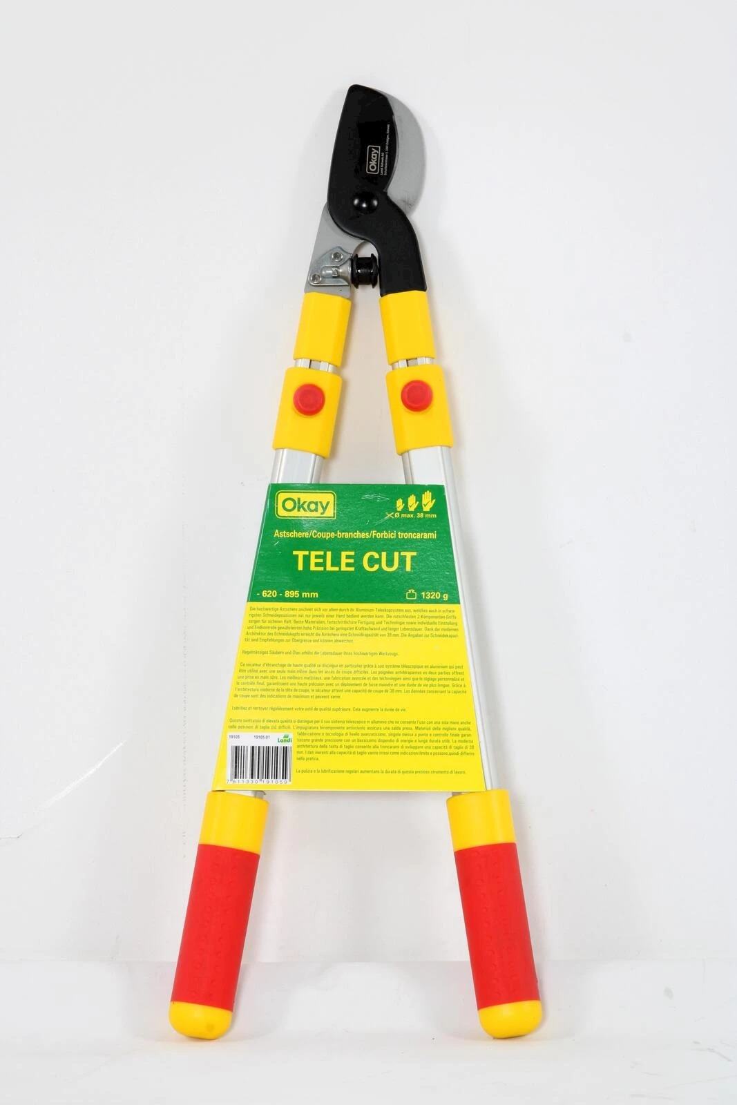 Le coupe-branches TeleCut Okay est équipé d'un système télescopique, réglable sur plusieurs positions. La cisaille est fabriquée en aluminium et a des poignées bi-composants. La longueur totale est d'env. 620/920 mm. Le coupe-branche TeleCut Okay vous permet de couper des branches jusqu'à Ø 38 mm sans problème.