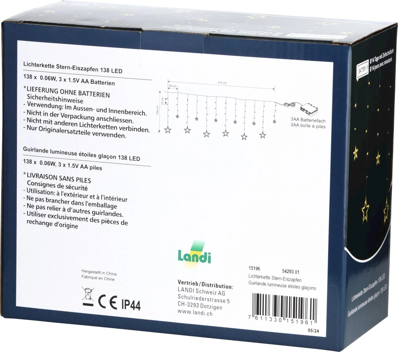 Guirlande lumineuse à piles pour l'intérieur et l'extérieur avec 138 LED et minuterie. Couleur de lumière : blanc chaud. Dimensions : 275 × 104 cm. Piles (3 × AA) non comprises.