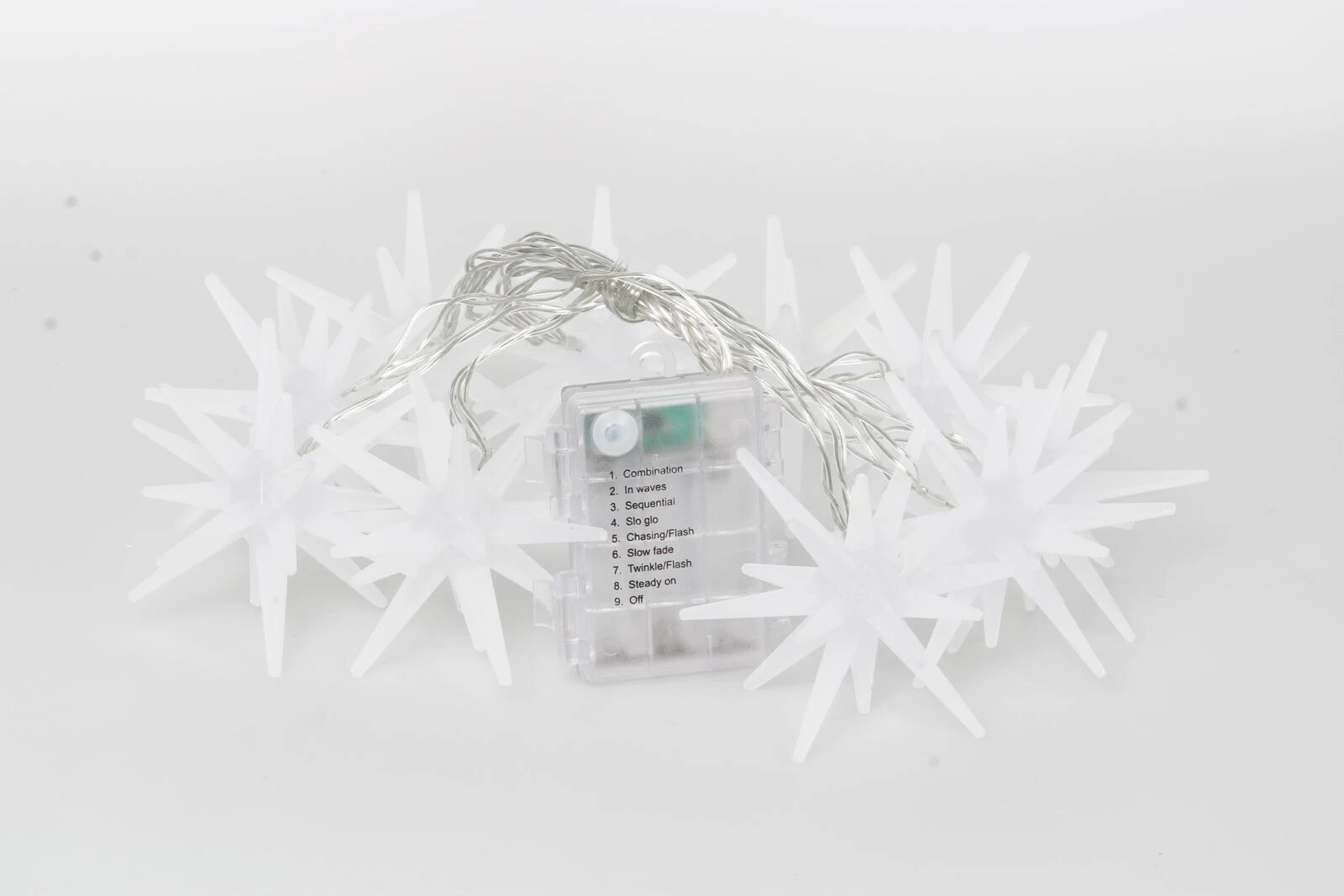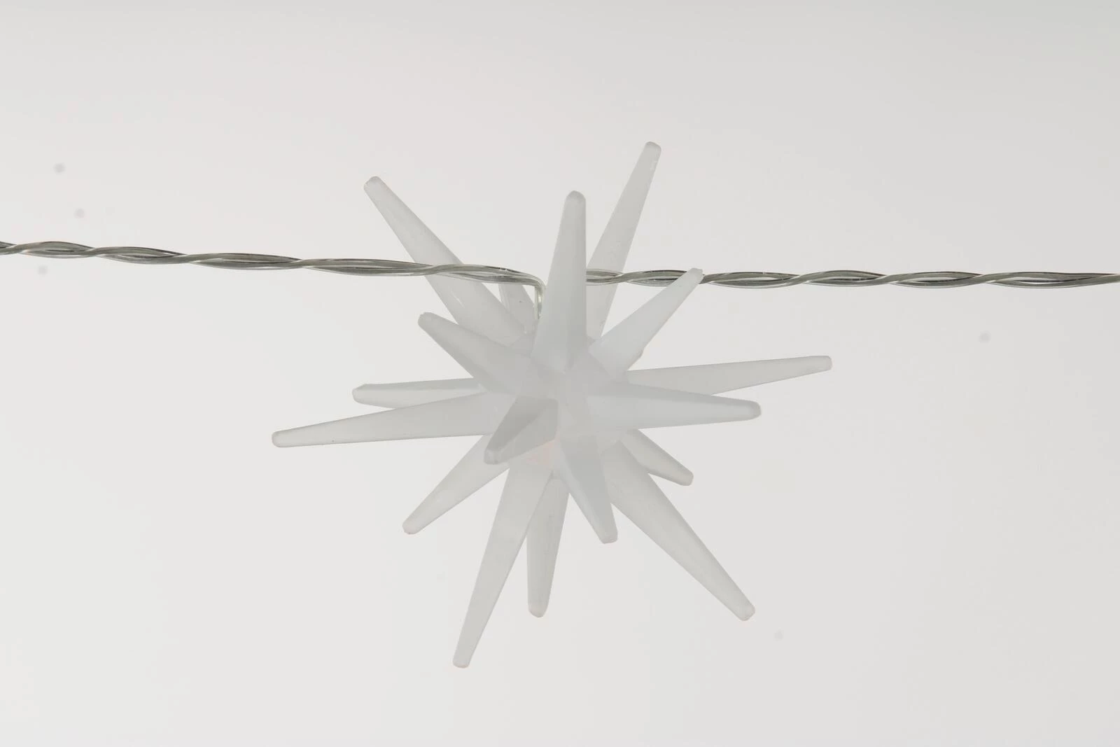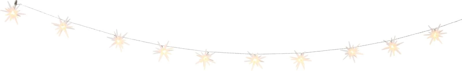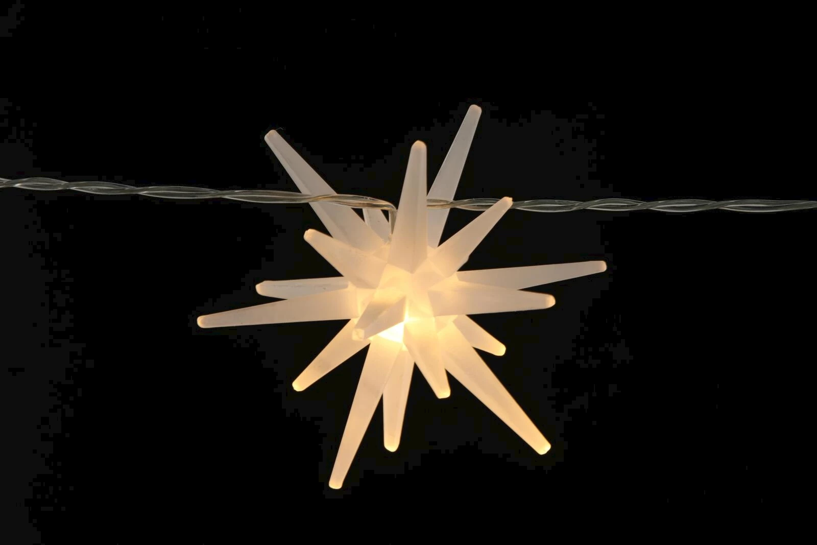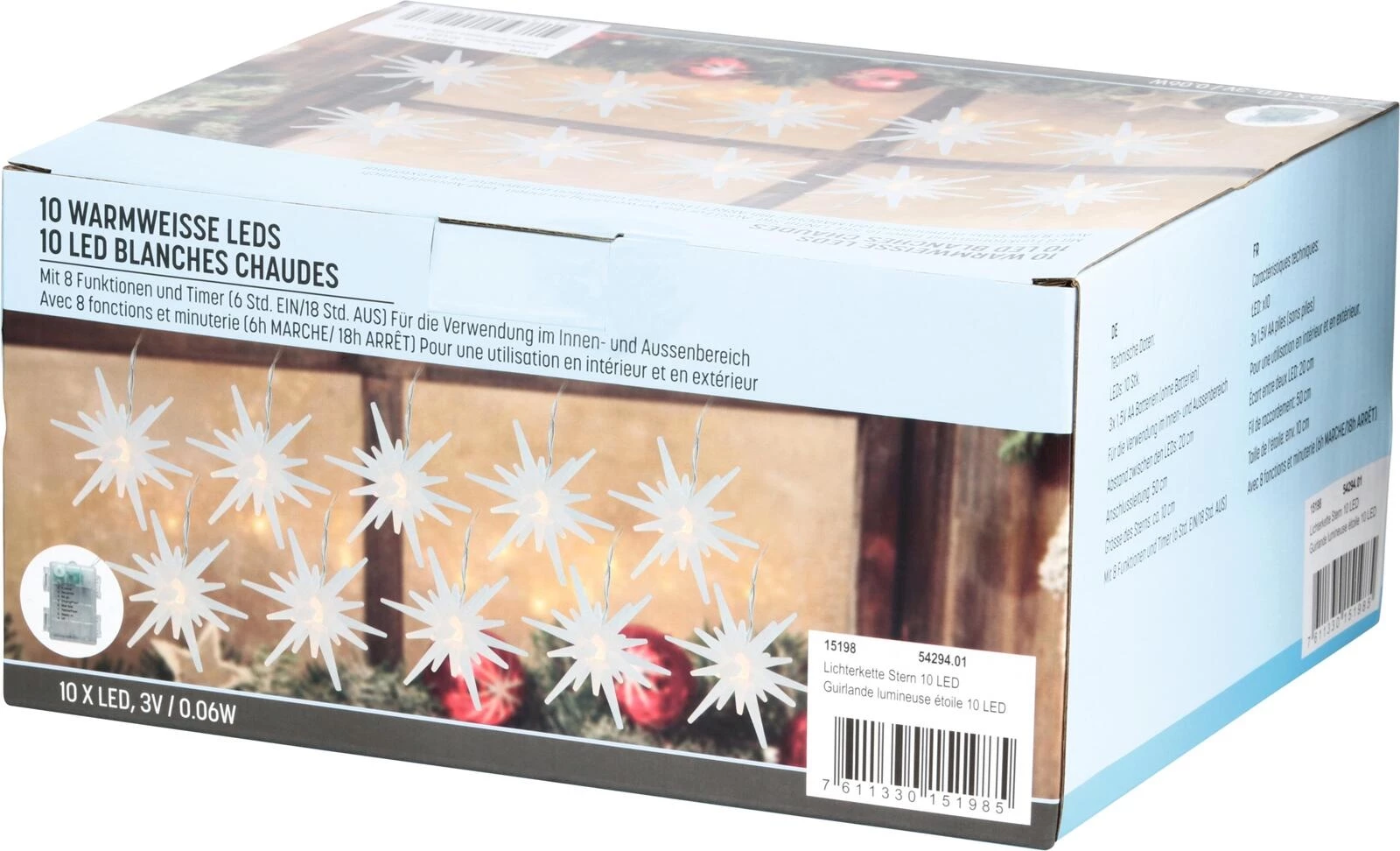 La guirlande lumineuse étoile à 10 LED blanc chaud fonctionne sur piles et crée une ambiance magique dans votre maison ou votre jardin. Avec une longueur totale de 230 cm, elle est idéale pour de multiples possibilités de décoration à l'intérieur et à l'extérieur. Grâce à la fonction de minuterie 6/18 h intégrée, vous pouvez facilement automatiser l'éclairage. Les 8 programmes d'éclairage différents vous offrent la flexibilité de choisir entre différents effets tels que le clignotement, l'alternance douce ou la lumière continue. La guirlande lumineuse fonctionne avec 3 piles AA (non fournies) et offre ainsi une liberté maximale de placement, sans qu'il soit nécessaire de disposer d'une prise de courant à proximité.