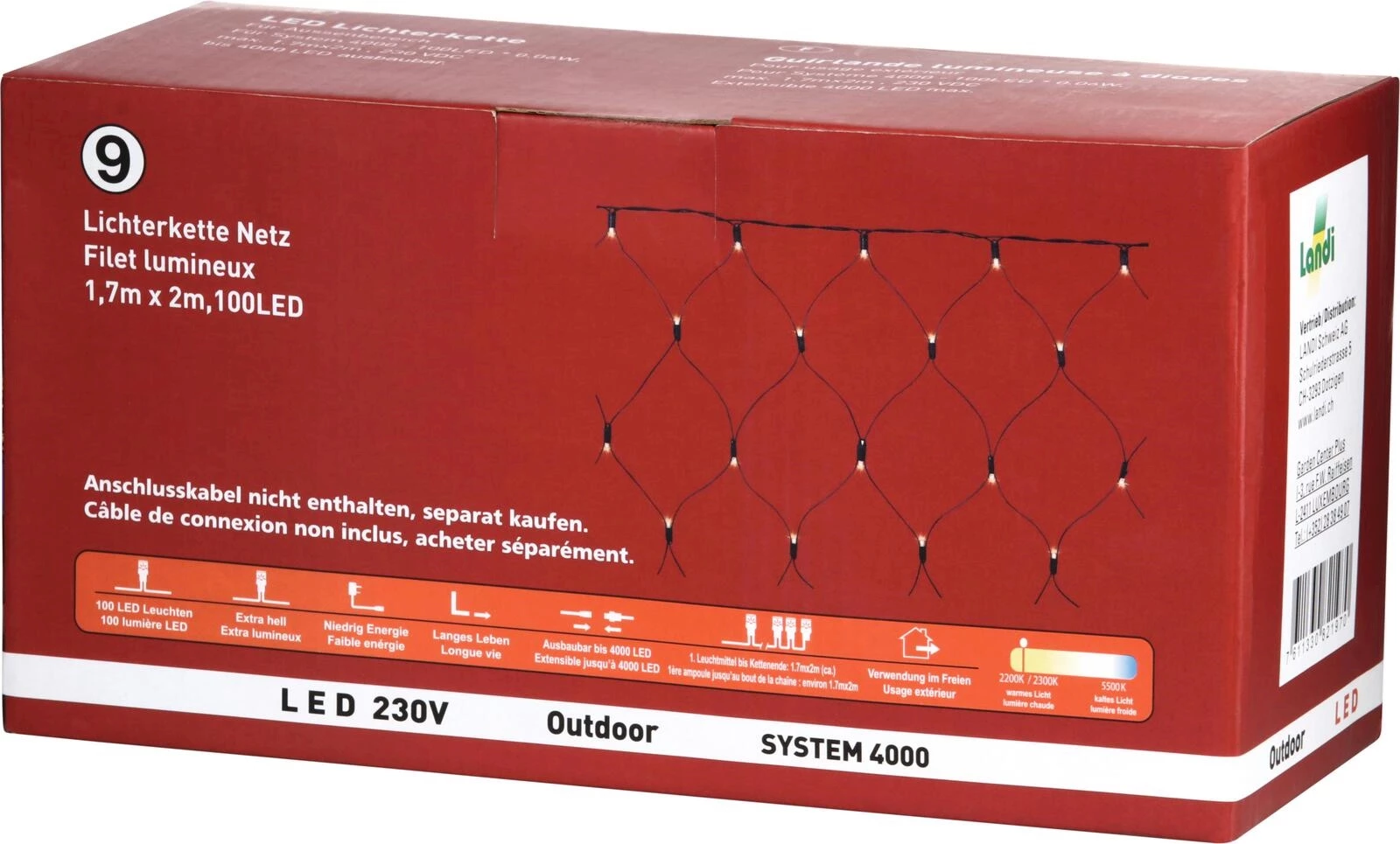 La guirlande lumineuse mesure 1,7 × 2 m et possède 100 LED blanc chaud qui pendent vers le bas en formant des brins latéraux. La guirlande lumineuse convient pour l'intérieur et l'extérieur et possède la classe de protection IP55. La pièce de raccordement au système 4000 est comprise dans la livraison.