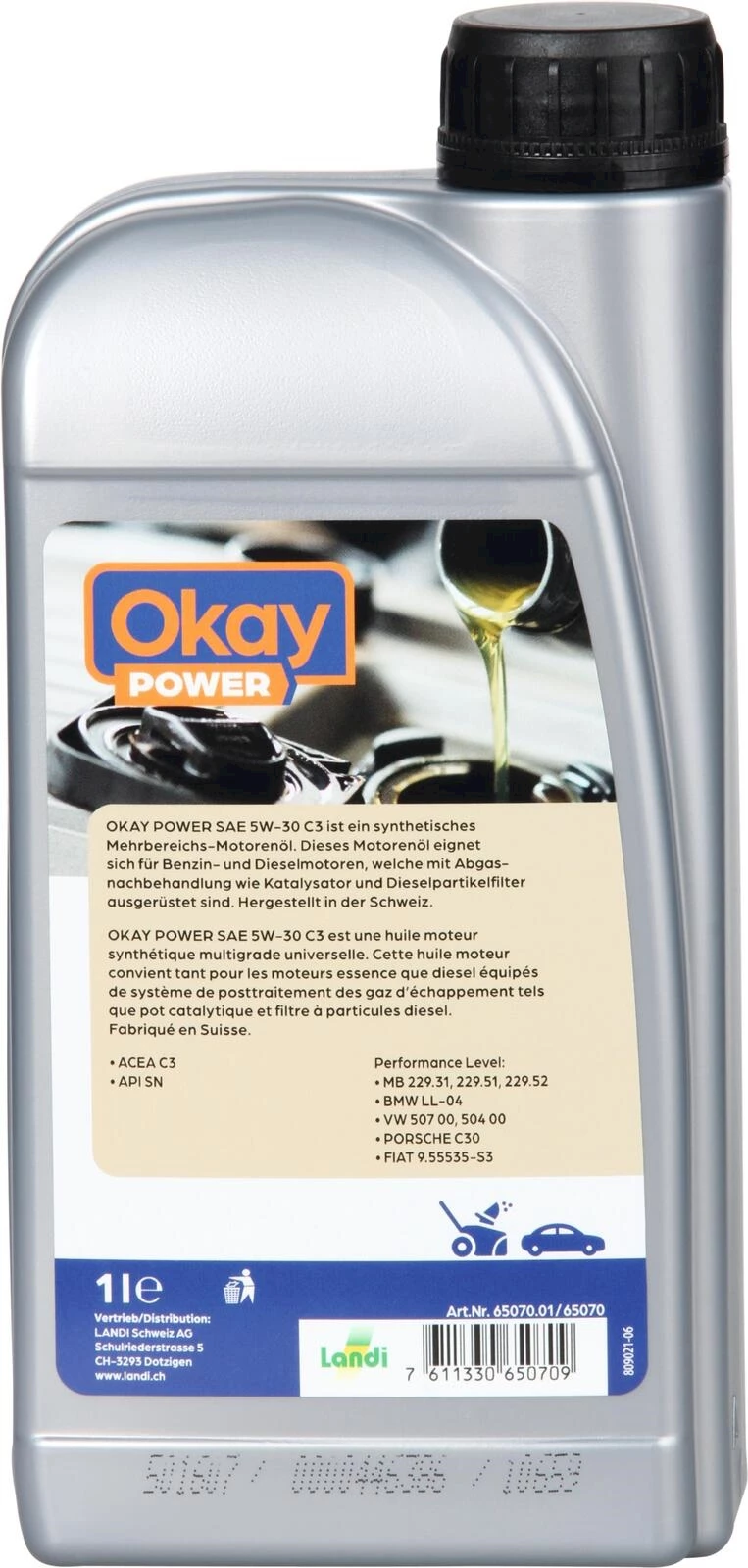 L'huile moteur Okay Power 5W/30 est une huile moteur universelle multigrade. Cette huile moteur convient aux moteurs à essence et diesel qui sont équipés d'un traitement des gaz d'échappement comme un catalyseur et un filtre à particules diesel. Elle est conçue pour des intervalles de vidange prolongés. Respecter les prescriptions du fabricant. L'huile soutient la technologie Low SAPS, offre un temps de pénétration court, une protection fiable contre l'usure sur toute la plage de température et est biodégradable selon OECD 301 E.