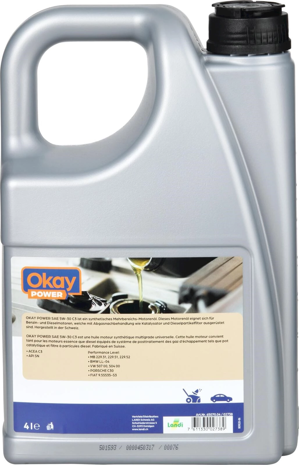 L'huile moteur Okay Power 5W/30 est une huile moteur universelle multigrade. Cette huile moteur convient aux moteurs à essence et diesel qui sont équipés d'un système de post-traitement des gaz d'échappement comme un catalyseur et un filtre à particules diesel. Elle est conçue pour des intervalles de vidange prolongés. Respecter les prescriptions du fabricant. L'huile soutient la technologie Low SAPS, offre un temps de pénétration court, une protection fiable contre l'usure sur toute la plage de température et est biodégradable selon la norme OECD 301 E.