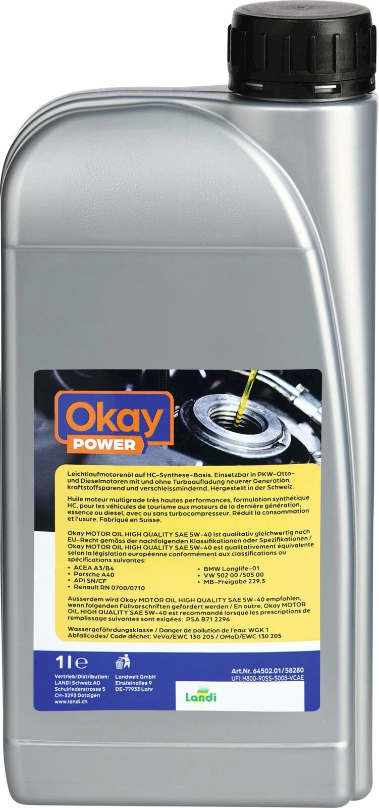 Okay Power HIGHTEC SAE 5W-40 a été spécialement conçue pour répondre aux besoins des véhicules à essence et diesel. Elle est particulièrement adaptée aux moteurs à essence et diesel avec et sans suralimentation à turbocompresseur et est utilisée pour les véhicules sans prolongation de l’intervalle d’entretien. Le concept permet un large spectre d’utilisation et garantit un fonctionnement sûr dans toutes les conditions de fonctionnement. L’huile entièrement synthétique empêche de manière fiable le collage, la formation de vernis et la carbonisation des cylindres, des pistons, des soupapes et des turbocompresseurs. Un fonctionnement sûr tout au long de l’année est toujours garanti grâce à un excellent comportement à la température de la viscosité. De plus, elle présente une grande stabilité au cisaillement, de bonnes propriétés de démarrage à froid et un graissage rapide du moteur, même avec une huile chaude et des charges extrêmes. Le film lubrifiant se comporte de manière stable et offre une protection élevée contre l’oxydation grâce à des huiles de synthèse HC sélectionnées et à des additifs spéciaux.