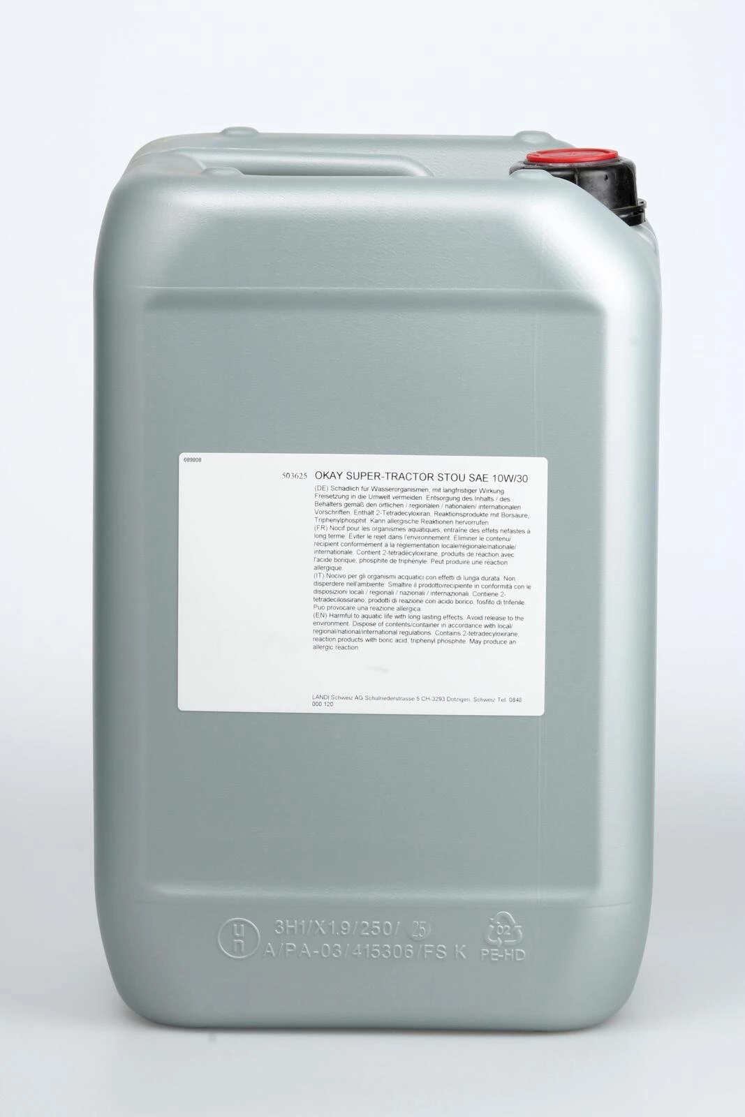 L'huile moteur Okay STOU SAE 10W/30 est utilisée sur les tracteurs et les machines de chantier comme huile universelle pour la transmission et l'hydraulique. Grâce à son additivation équilibrée, elle convient comme huile de boîte de vitesses dans les boîtes de vitesses manuelles, intermédiaires et de transfert ainsi que comme huile de boîte d'essieu. En particulier aussi pour les essieux et les boîtes de vitesses avec freins humides, embrayages multidisques et différentiels à glissement limité. Respecter les prescriptions du fabricant. La STOU possède de bonnes propriétés haute pression, forme un film lubrifiant stable au cisaillement avec des propriétés haute pression fiables. L'huile protège vos machines contre la corrosion, la formation de boue et réduit l'usure. Une performance constante des freins humides est en tout cas garantie, même en cas de charge permanente.