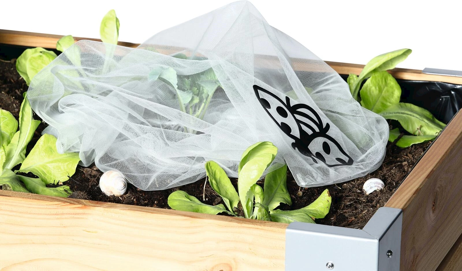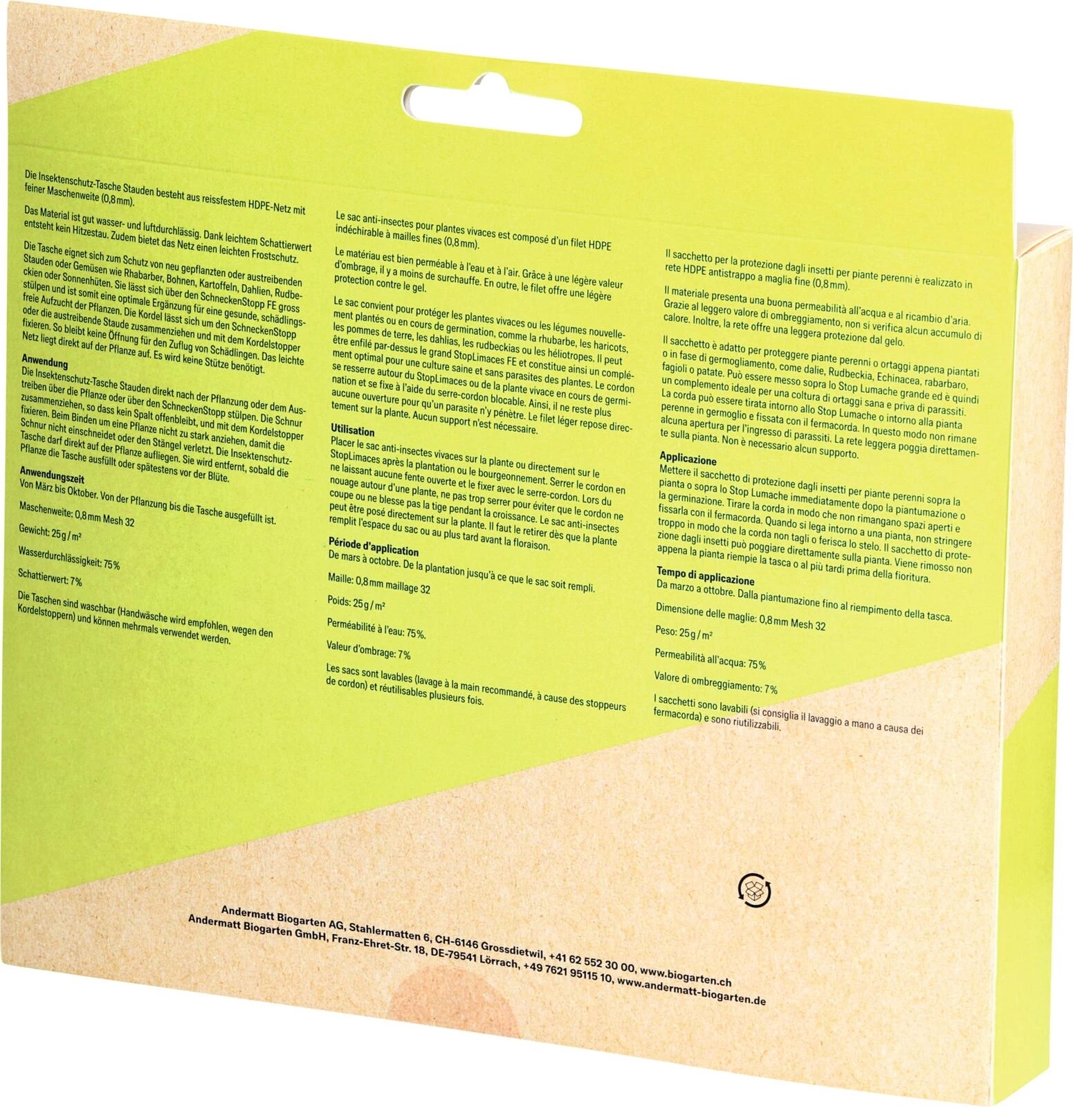Le sac convient pour protéger les plantes vivaces ou les légumes nouvellement plantés ou en cours de germination, comme la rhubarbe, les haricots, les pommes de terre, les dahlias, les rudbeckias ou les héliotropes. Il peut être enfilé par-dessus le stop-limaces (17195) et constitue ainsi un complément optimal pour une culture saine et sans parasites des plantes. La cordelette se resserre autour du stop-limaces ou de la plante vivace en cours de bourgeonnement et se fixe à l'aide de l'arrêt de cordelette, ne laissant aucune ouverture pour l'arrivée de parasites. Le filet léger repose directement sur la plante, de sorte qu'aucun support n'est nécessaire.