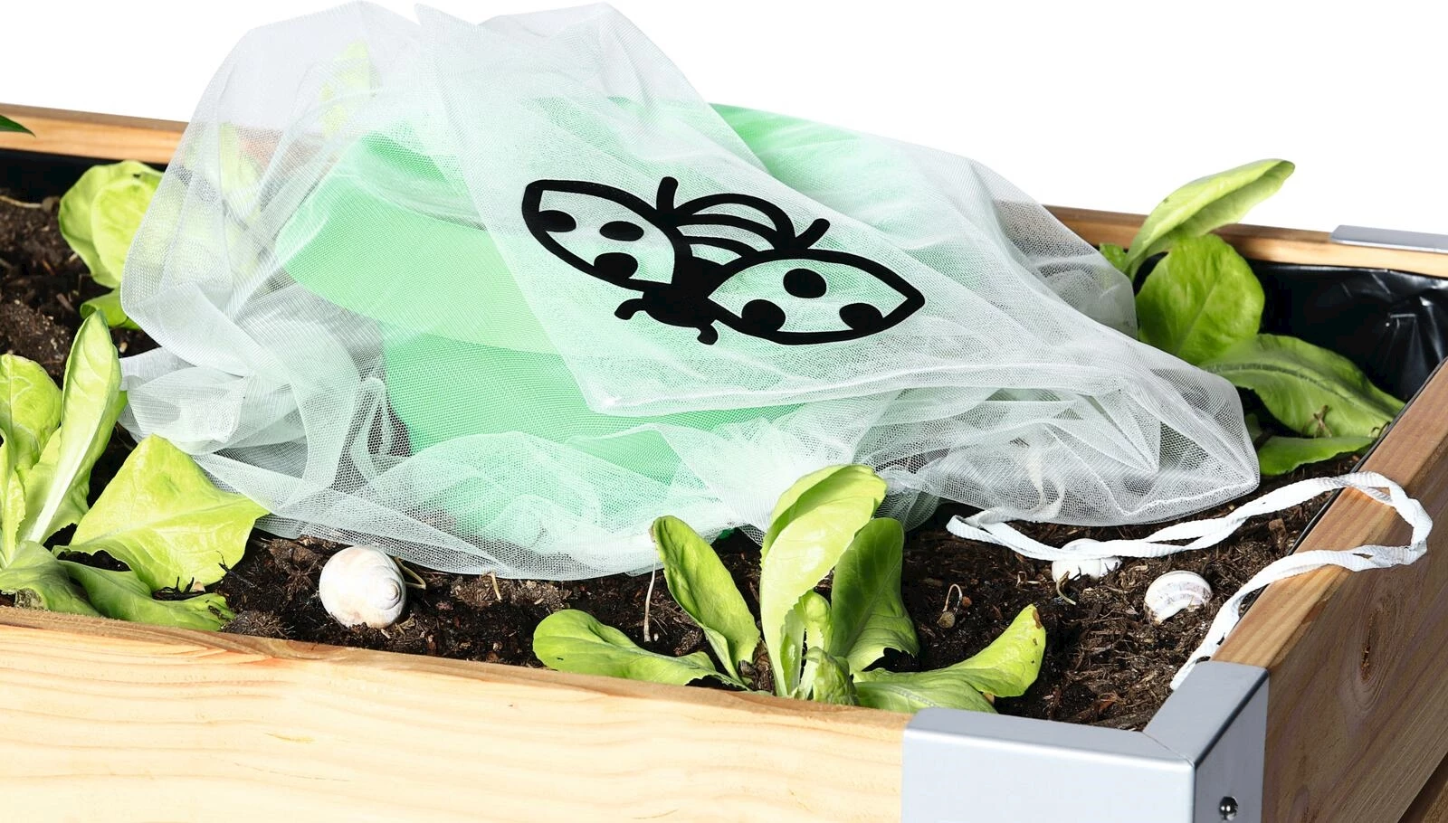 Le sac anti-insectes est composé d'un filet HDPE et a des mailles de 0,8 mm. Le matériau est perméable à l'air et à l'eau. Grâce à sa légère valeur d'ombrage, il n'y a pas d'accumulation de chaleur. En outre, le filet offre une légère protection contre le gel.