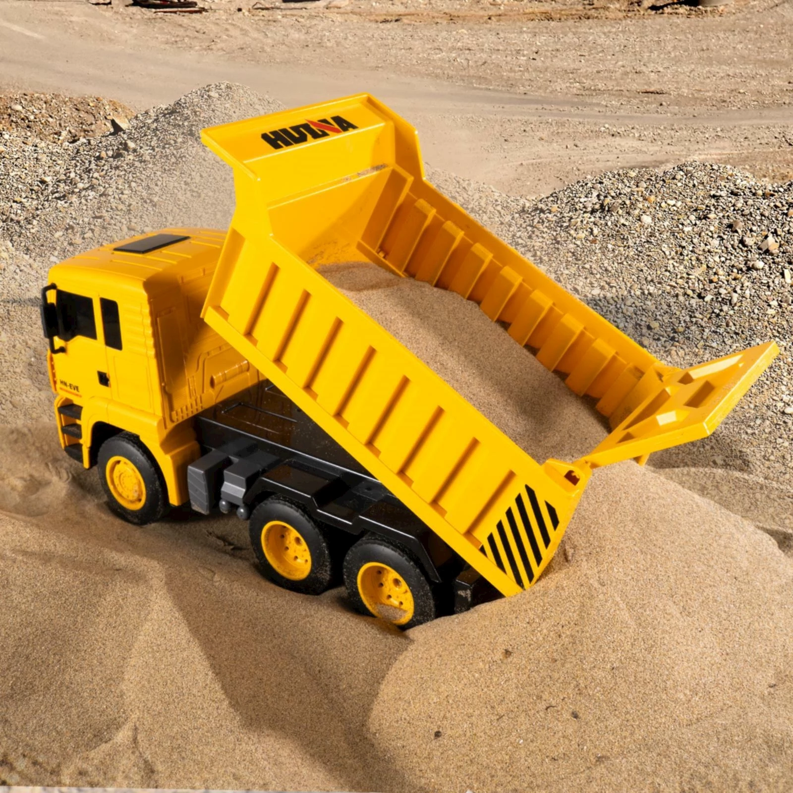 Le camion-benne télécommandé à l'échelle 1:18 donne de vraies sensations de chantier. La télécommande 2,4 GHz permet non seulement de conduire et de diriger le véhicule, mais aussi d'incliner la surface de chargement de manière réaliste pour transporter et décharger des matériaux de construction. Les roues robustes avec un profil adhérent assurent une bonne adhérence sur différentes surfaces comme le sable ou le gravier. Les phares avant complètent le design authentique et permettent de jouer même à la tombée de la nuit.