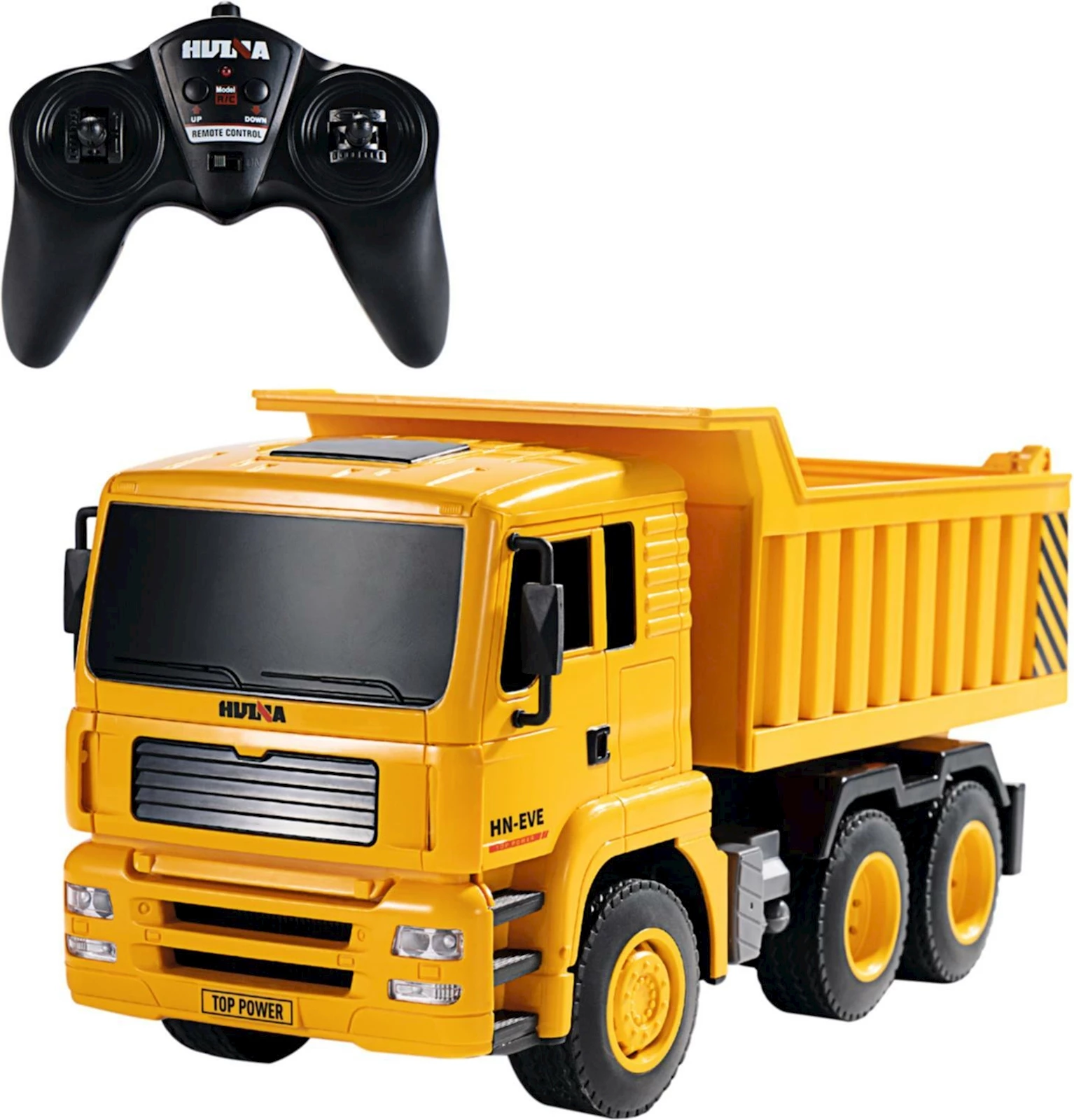 À partir de 8 ans. Camion-benne télécommandé à l'échelle 1:18 avec phares avant et benne basculante.