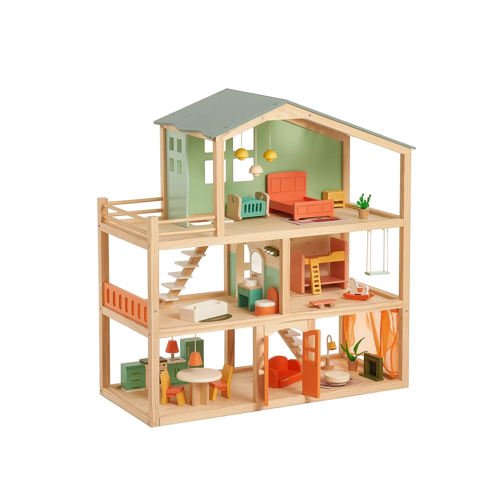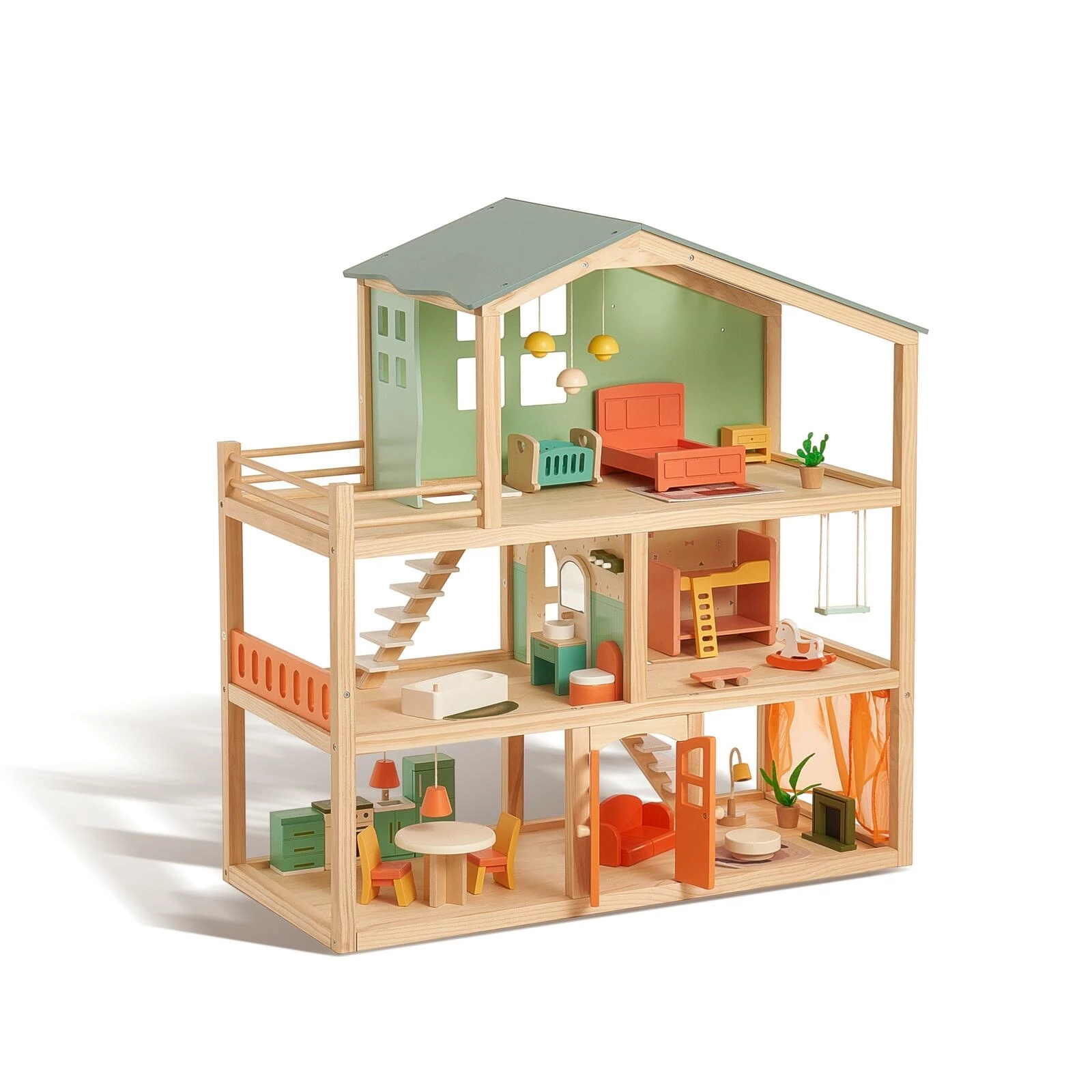 Avec ses dimensions de 71 × 33 × 76 cm, la maison est suffisamment grande pour des heures de jeu, tout en restant maniable et décorative dans la chambre d'enfant. Cette maison de poupées en bois de haute qualité favorise la créativité, la motricité fine et les compétences sociales.