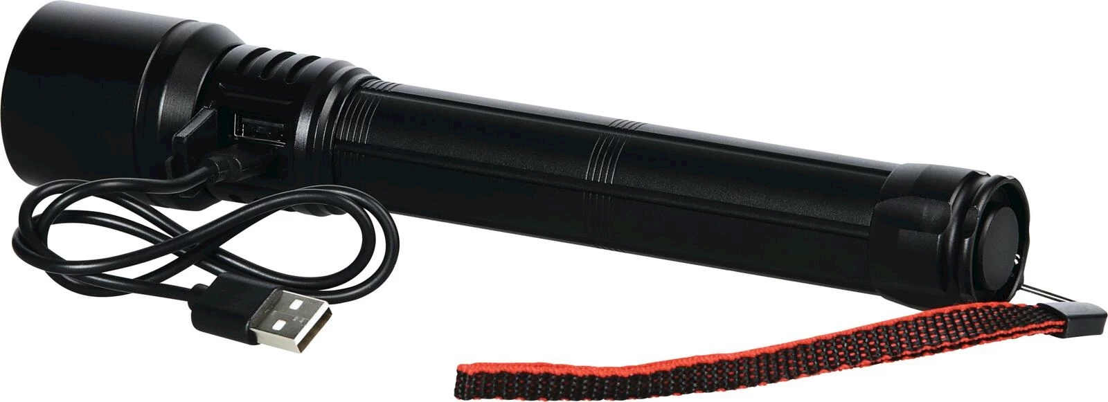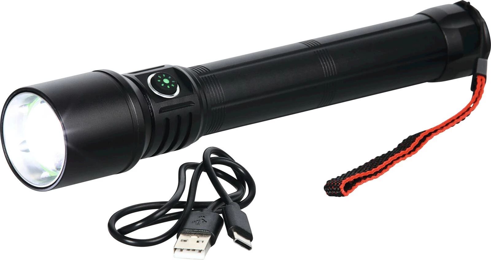 Avec 5 modes : haut, moyen, bas, SOS, stroboscope. Portée de 500 m, 800 lm. Autonomie : env. 2,5 h. Dimensions : 4,5 × 3 × 22,1 cm. Câble de chargement USB-C inclus.