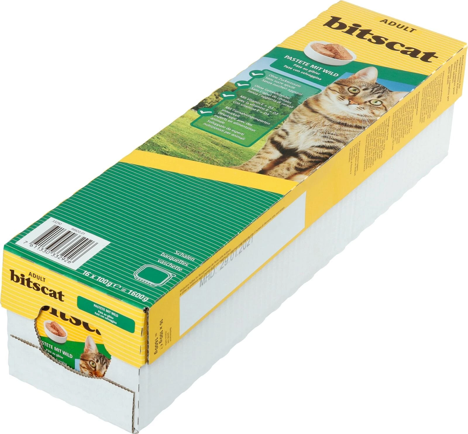 Le pâté au gibier de bitscat est un aliment complet pour chats adultes. Il se compose de viande et de sous-produits animaux (dont 4 % de gibier) et de minéraux. Cette nourriture pour chats est sans colorants, arômes ou conservateurs ajoutés et sans céréales ni sucres ajoutés. Un paquet contient 16 barquettes de cette délicieuse nourriture pour chats au gibier. Cette nourriture a été développée en collaboration avec des experts en nutrition animale.