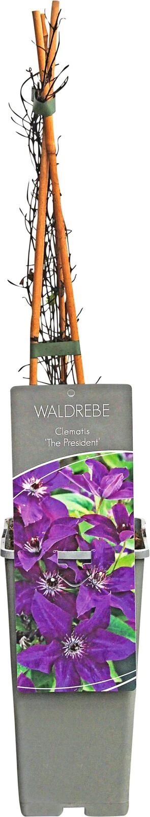 La clématite 'President' est une belle plante grimpante qui se distingue par ses grandes fleurs violet foncé à rouge pourpre. Les fleurs ont une forme élégante d'étoile et apparaissent de juin à septembre. Cette clématite pousse vigoureusement et convient parfaitement pour les pergolas, les treillages, les clôtures ou les murs.