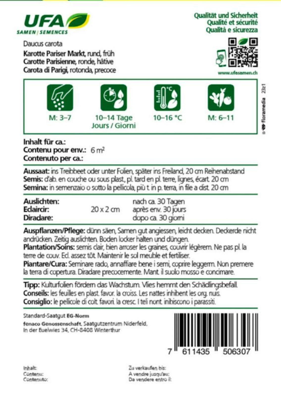 La carotte Marché de Paris est une variété de carotte précoce, courte et ronde comme un œuf. Elle convient parfaitement pour les premiers « goûters » du jardin et est particulièrement décorative dans l'assiette. Avec sa peau lisse et son goût sucré, cette carotte est un ingrédient merveilleux pour les salades fraîches ou comme garniture. Malgré leur croissance courte, elles offrent une récolte importante. La carotte Marché de Paris est idéale pour la culture dans les petits jardins et les plates-bandes et offre une bonne récolte même sur de plus grandes surfaces. Cette variété est parfaite pour la première récolte de l'année et apporte de la couleur et de la variété dans la cuisine.