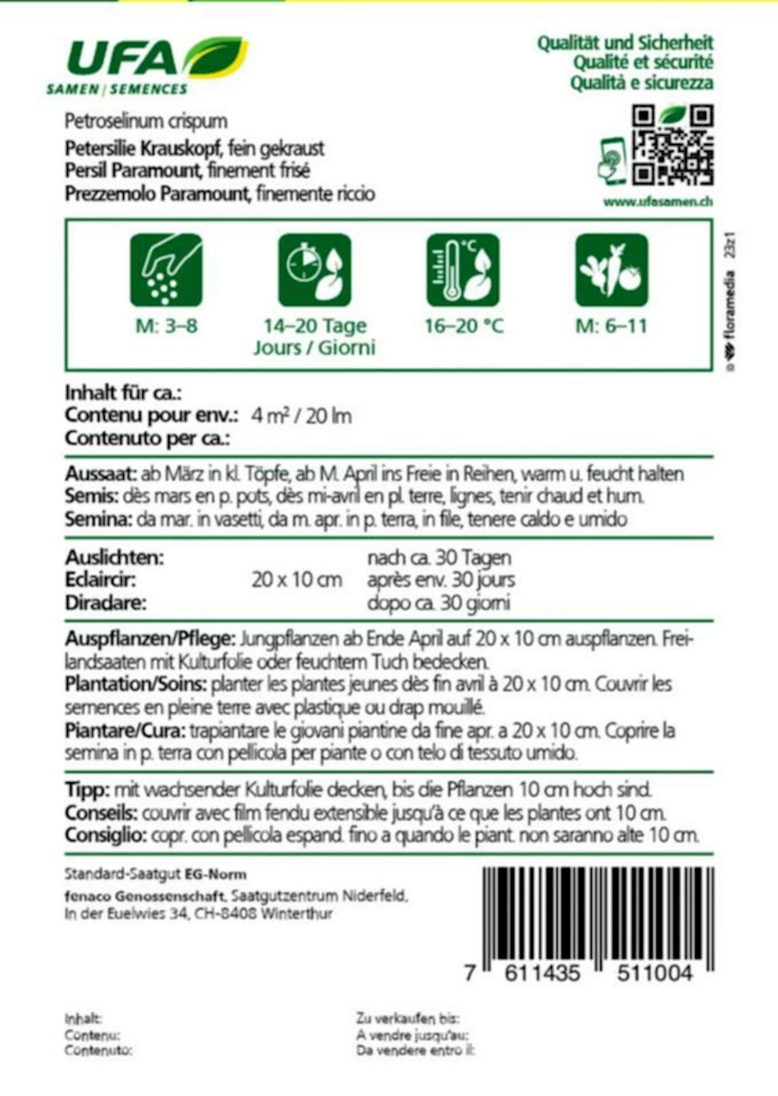 Le persil frisé préfère les emplacements ensoleillés à mi-ombragés et se développe mieux dans les sols profonds, bien drainés et humifères. Une fertilisation régulière favorise une croissance saine. Lors de la taille, il faut toujours procéder de l'extérieur vers l'intérieur afin de favoriser une nouvelle croissance. Pour obtenir la meilleure qualité, le persil doit être récolté avant la floraison, car le goût devient souvent plus amer après la floraison et la plante perd sa fraîcheur.