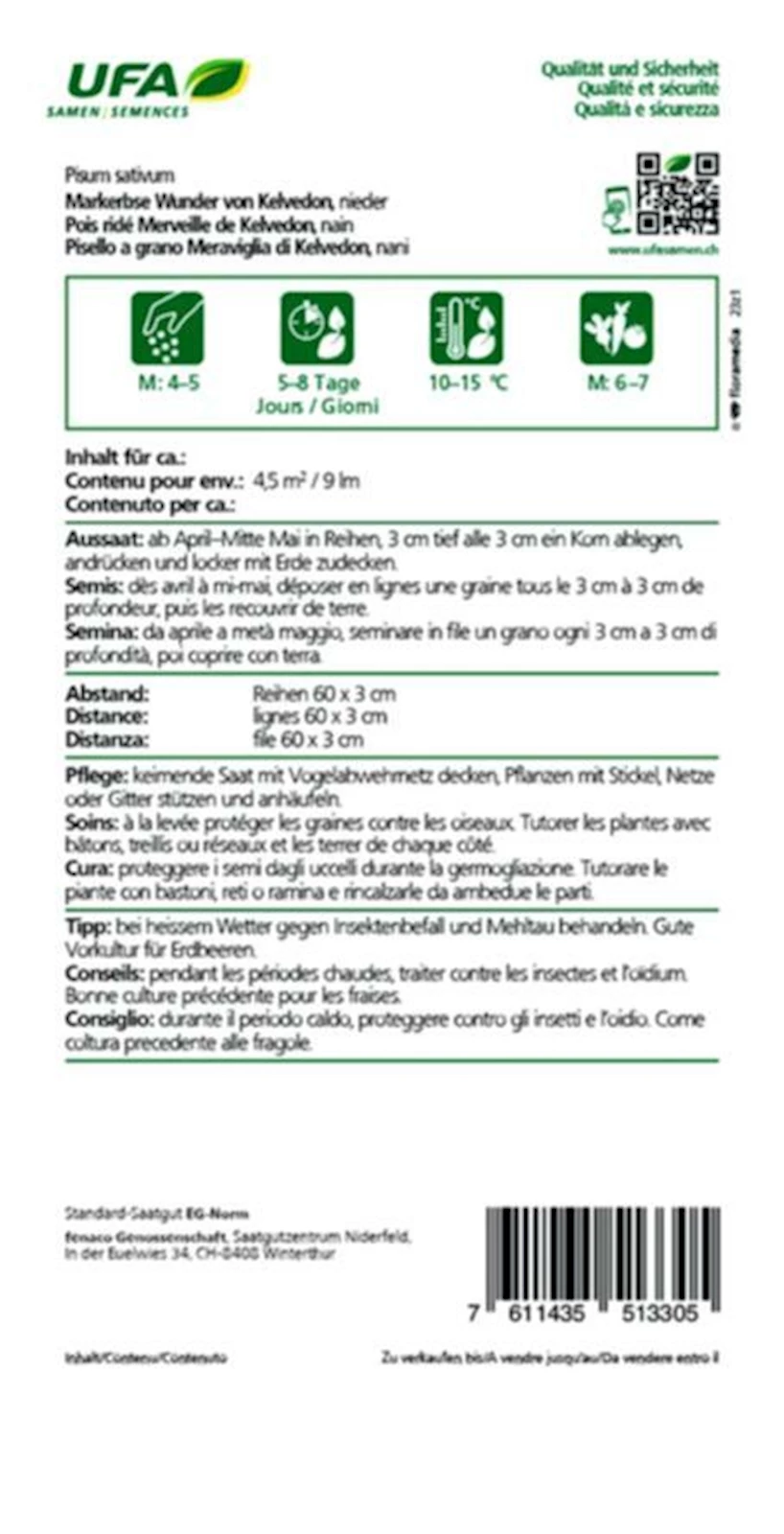 récolter tôt et régulièrement, dès que les gousses sont bien remplies, cela favorise la formation de nouvelles gousses. En culture mixte, le Wunder von Kelvedon s'harmonise bien avec les carottes, la salade ou le chou-rave.