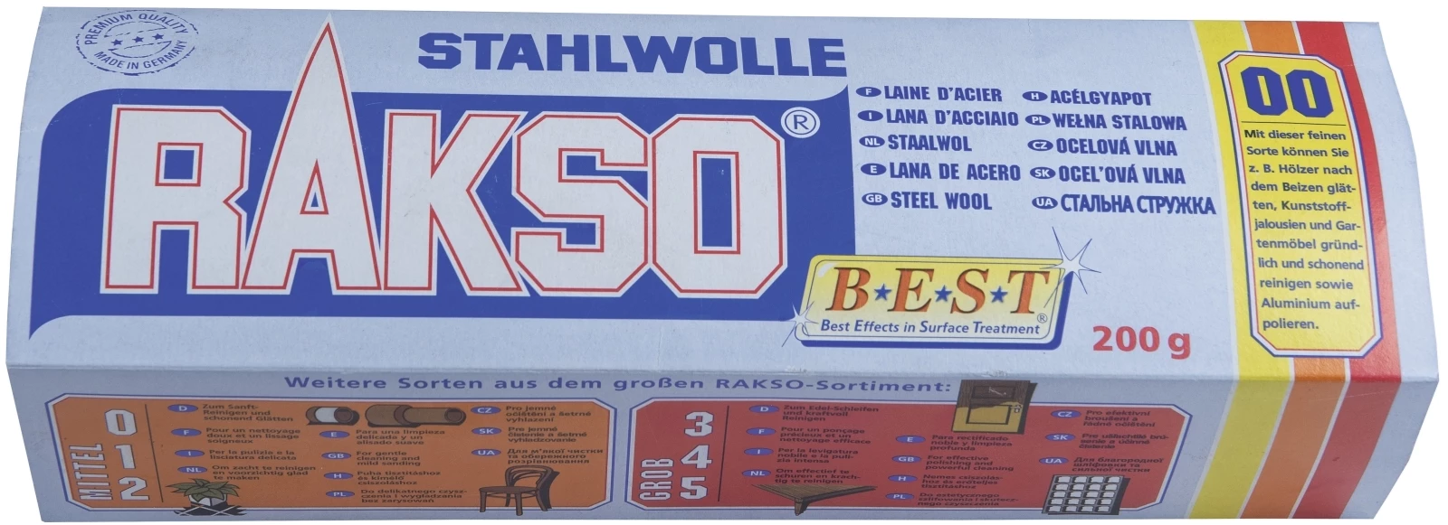 La laine d’acier n° 00 est fabriquée à partir des bandes de laine d’acier pur de qualité 1A. La laine d’acier fine sert p. ex. à lisser les bois après la teinture, polir les bois recirés, nettoyer en profondeur et en douceur les stores en plastique et les meubles de jardin et polir l’aluminium, le cuivre et le laiton.