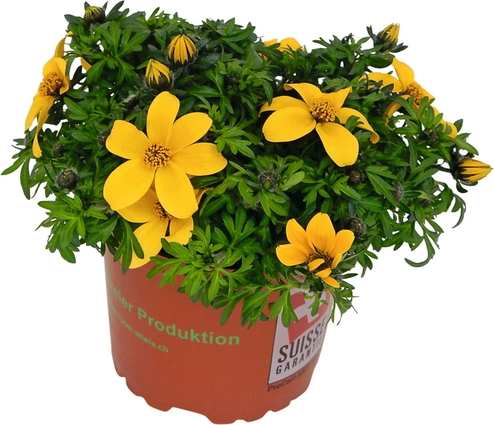 Le bidens (Bidens ferulifolius) appelé également Goldmarie est un arbrisseau annuel. Elle est une plante d’été gratifiante qui n’a besoin que d’un minimum d’entretien et apprécie les emplacements particulièrement ensoleillés. Le Goldmarie fleurit entre mai et octobre et est favorable aux insectes. Il atteint une hauteur maximale d’env. 15 à 30 cm. Du terreau courant peut être utilisé comme substrat.