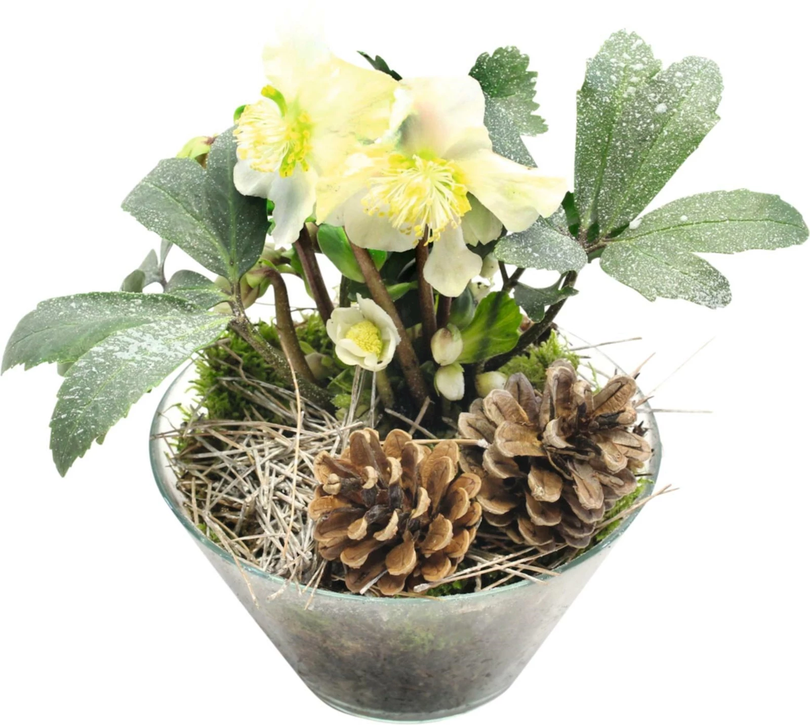Belle rose de Noël plantée en verre. Elle résiste au gel, est vivace et fleurit de novembre à avril. Emplacement : mi-ombragé, à l'abri et dans un sol riche en substances nutritives.