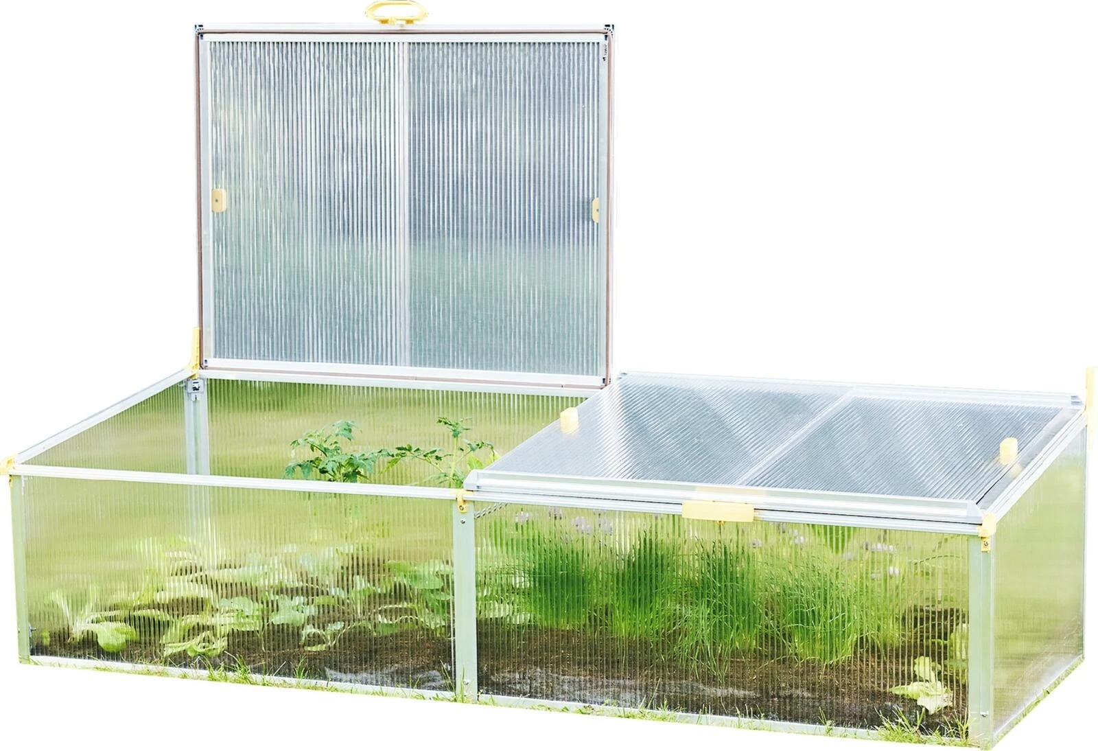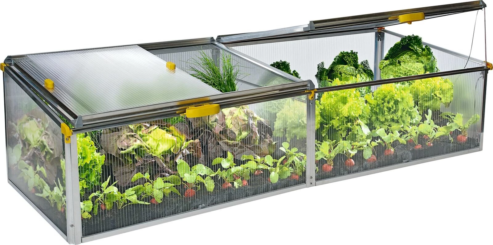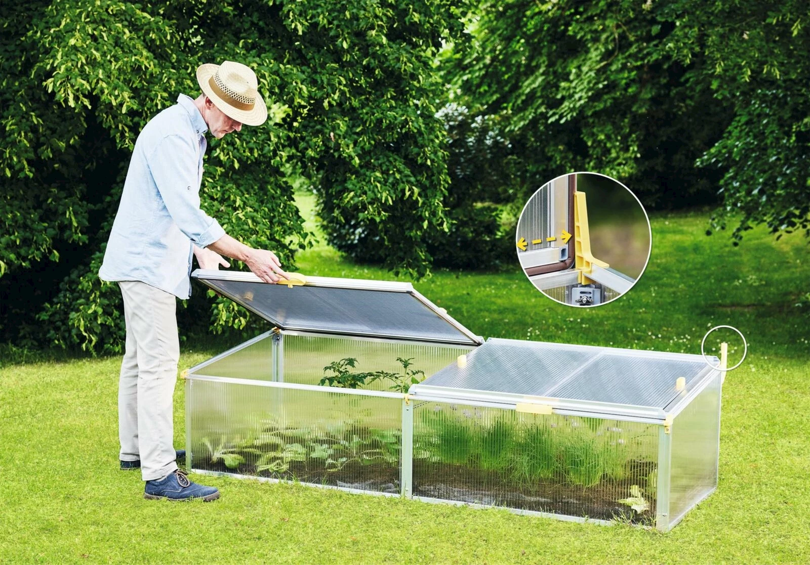 La plate-bande est aérée en continu par les fenêtres coulissantes avec le filet antiparasitaire intégré. Les vitres thermiques peuvent être retirées en été, le filet protège du soleil, de la grêle et des nuisibles. Cette couche précoce est extrêmement stable grâce à son cadre en aluminium solide et résistant à la corrosion. L'aération en continu par les fenêtres coulissantes garantit un apport optimal en oxygène. Arrosage par le filet. Vitres thermiques de 8 mm, stabilisées contre les UV (garantie 10 ans contre les UV).