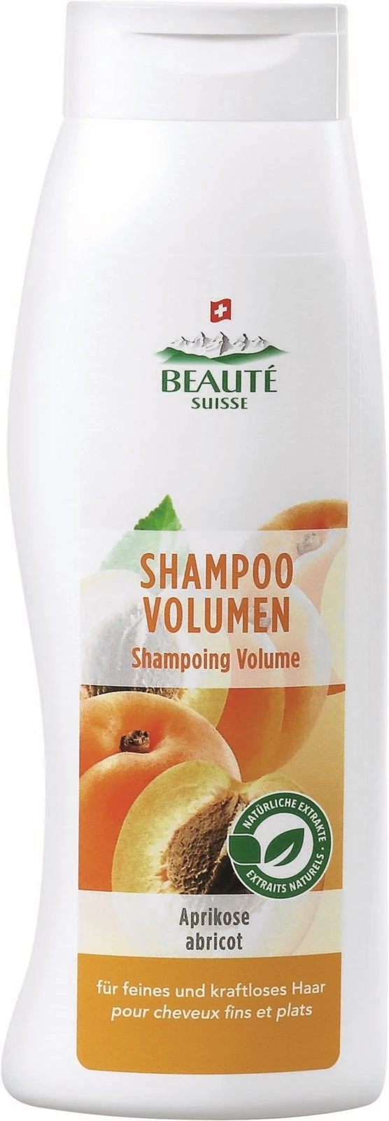 Le shampooing volume de Beauté Suisse à l'extrait naturel d'abricot convient aux cheveux fins et fragilisés. L'huile d'avocat hydratante donne à vos cheveux volume. 300 ml.