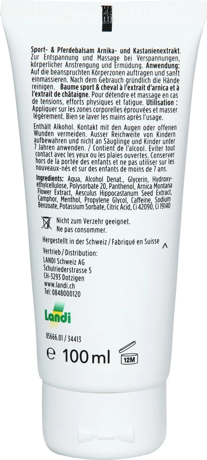 Le baume Sport et Cheval de Beauté Suisse aux extraits naturels d'arnica et de châtaigne convient parfaitement en cas de courbatures, d'effort physique et de fatigue. Le baume vegane a un effet refroidissant et relaxant et aide à soulager la douleur. Il peut aussi être employé au cours des massages. Le tube contient 100 ml de baume sans fragrances synthétiques ni parabènes. Végane.